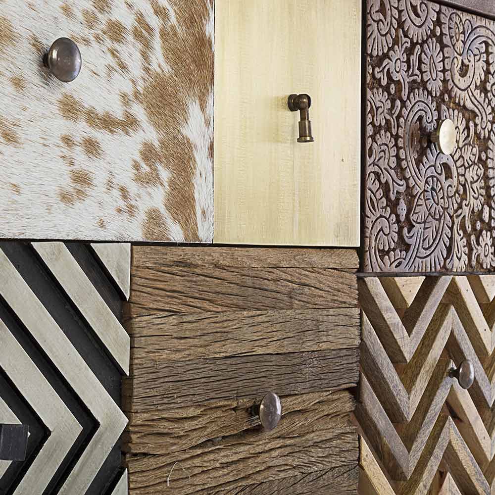 A parte frontal das portas é feita de madeira reciclada de manga e acácia com acabamento em pintura à base de água.