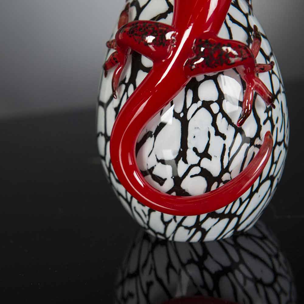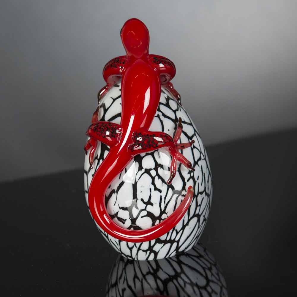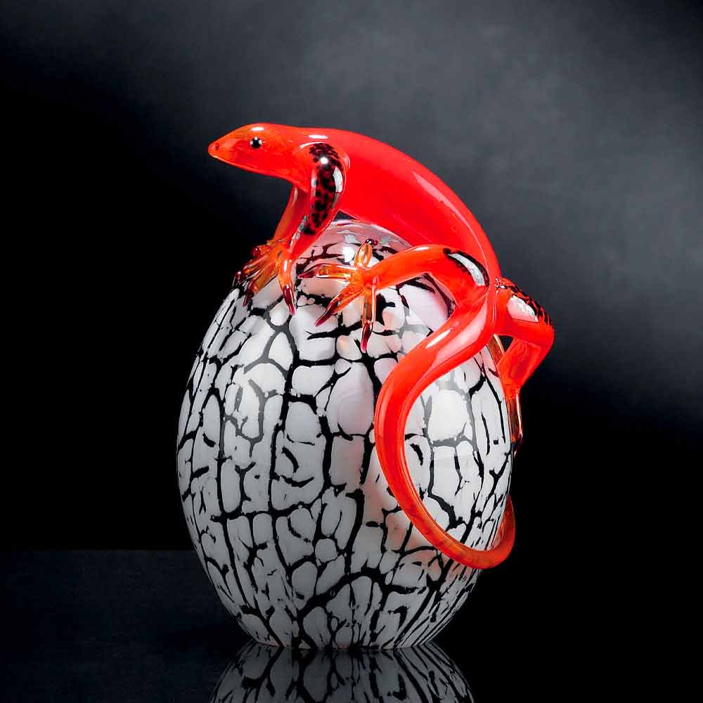 Estátua em forma de ovo com lagartixa feita na Itália em vidro branco, preto e vermelho . Um elemento decorativo excêntrico para os espaços da sua casa capaz de dar um toque original graças à sua forte personalidade criativa . A sua estética invulgar e colorida representa sem dúvida o seu ponto forte tornando-a uma ideia perfeita para quem gosta de enriquecer os ambientes da casa de uma forma original e elegante ao mesmo tempo, graças a um objecto sublinhado por linhas exclusivas e à elegância intemporal do vidro e suas cores maravilhosas. O resultado é um simples acessório decorativo para a casa capaz de enriquecer o estilo de qualquer casa com um toque de cor, graças à sua alma moderna e design vanguardista .