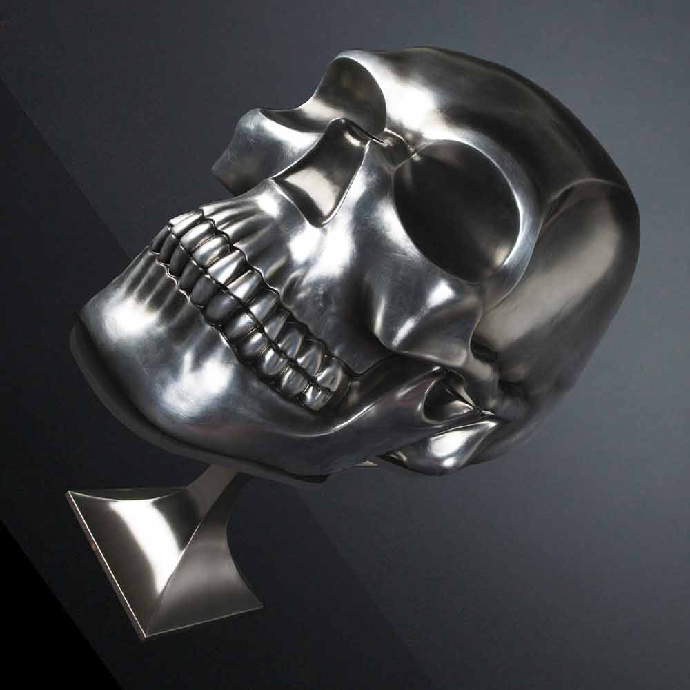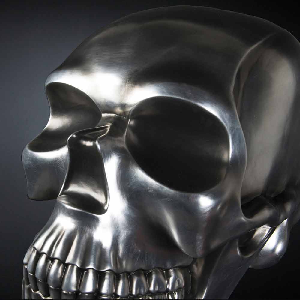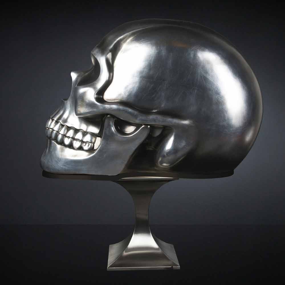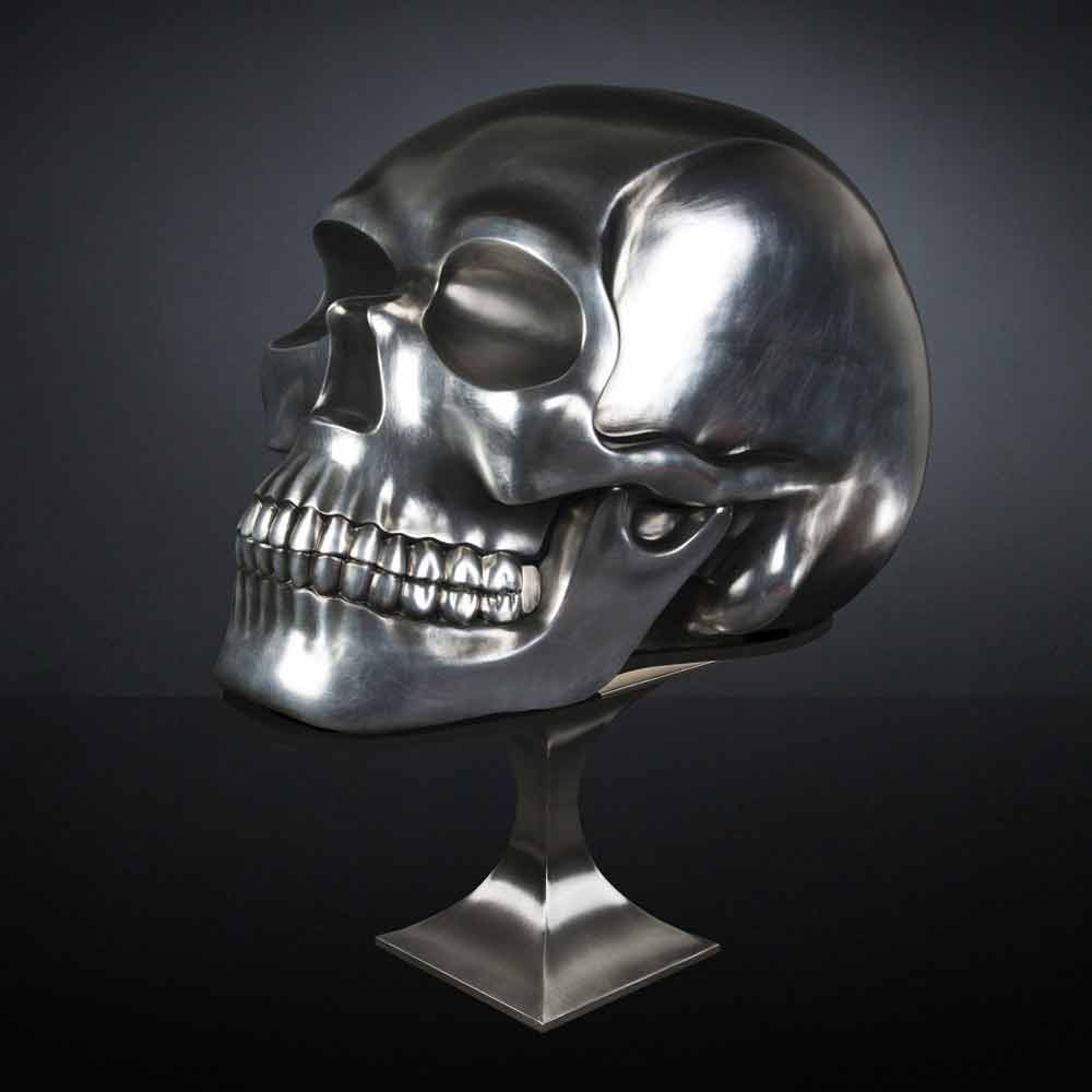 Estátua em forma de crânio feita na Itália em cerâmica de prata, luxo.