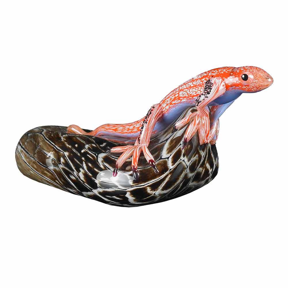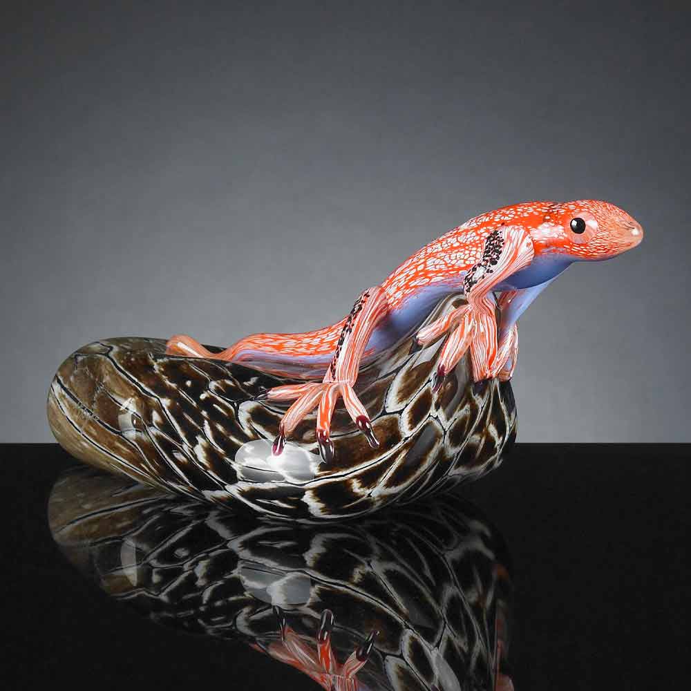 Ornamento em forma de lagarto sobre pedra em vidro colorido Fabricado na Itália, fino.