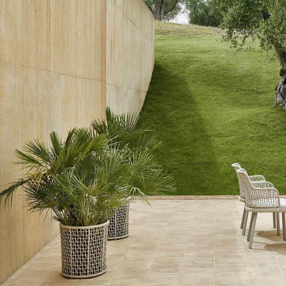 Plantador de exterior com pires composto por uma estrutura de alumínio revestido a pó e corda de acabamento bege tecida à mão . Caracterizado por um design essencial , este produto foi concebido e desenhado para representar uma solução prática e ao mesmo tempo enriquecer qualquer espaço exterior com um toque de personalidade moderna e refinada .
