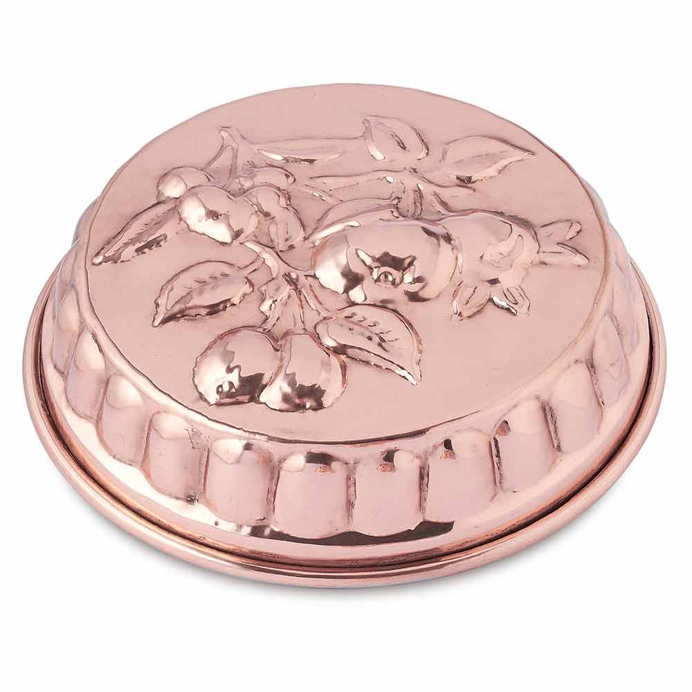 Assadeira redonda com decoração de frutas feita à mão em cobre estanhado Itália.