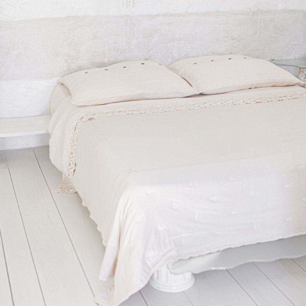 linho de alta qualidade e é macia ao toque graças a tratamentos especiais que realçam seu aspecto natural. É um tecido ideal para a cama, pois é