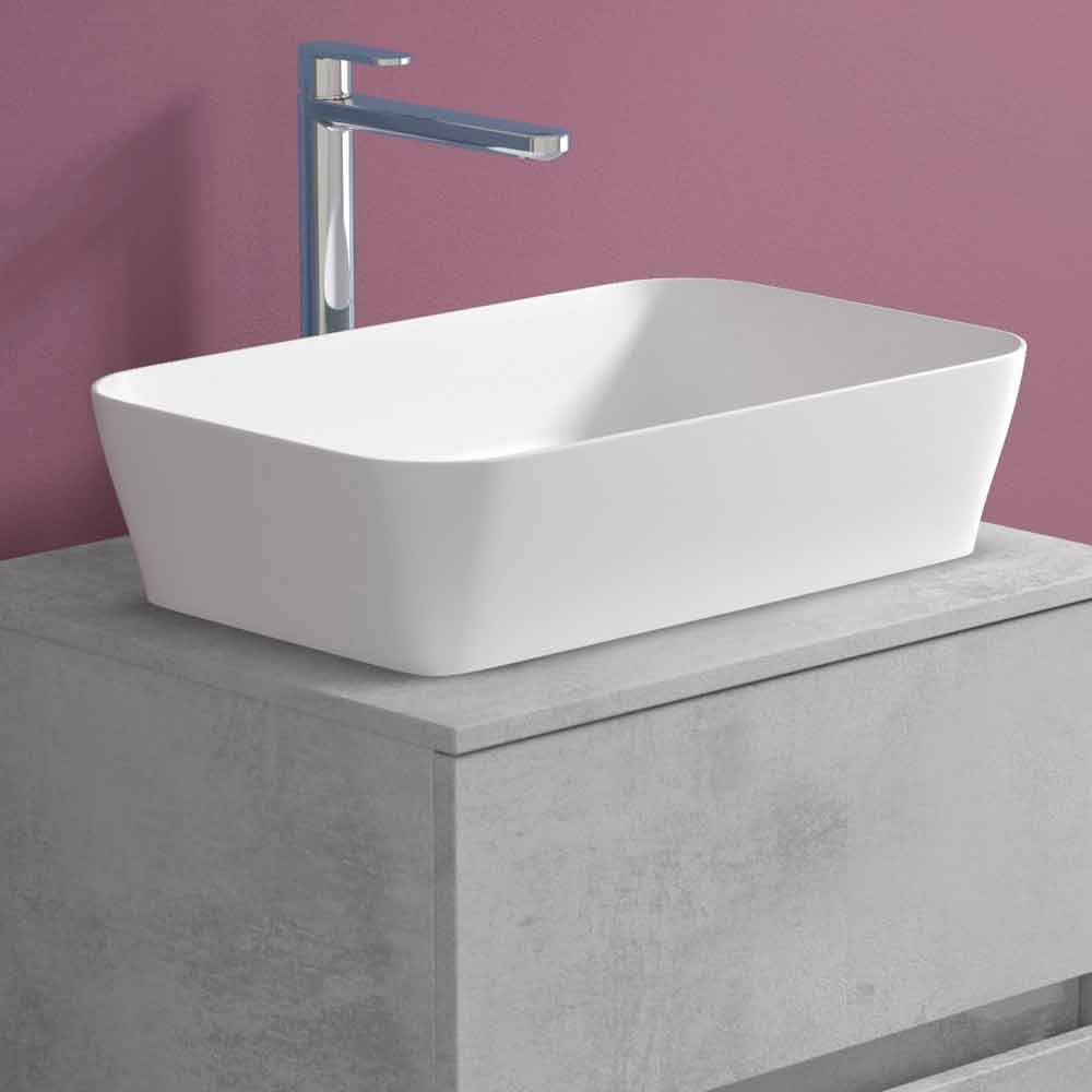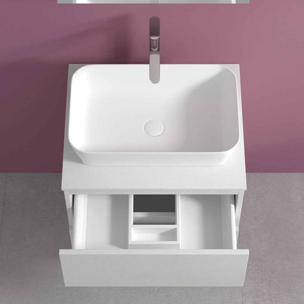 O lavatório retangular da bancada é confeccionado em Solid mate, uma resina mineral branca opaca , e com acabamento em gelcoat opaco , que torna o produto impermeável.