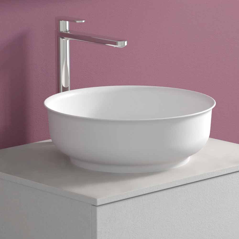 O lavatório redondo da bancada é feito de Solid mate, uma resina mineral branca opaca , e com acabamento em gelcoat opaco , que torna o produto impermeável.