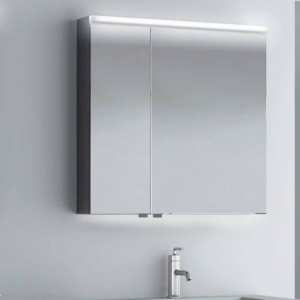 Gabinete de espelho de banheiro com duas portas e iluminação LED. Uma fina linha de luz transmite uma perfeita iluminação frontal, que pode ser facilmente controlada por um sensor.