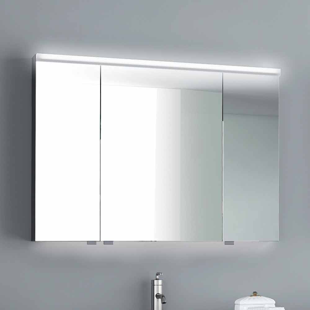 Gabinete de espelho de banheiro com três portas e iluminação LED. Uma fina linha de luz transmite uma perfeita iluminação frontal, que pode ser facilmente controlada por um sensor.