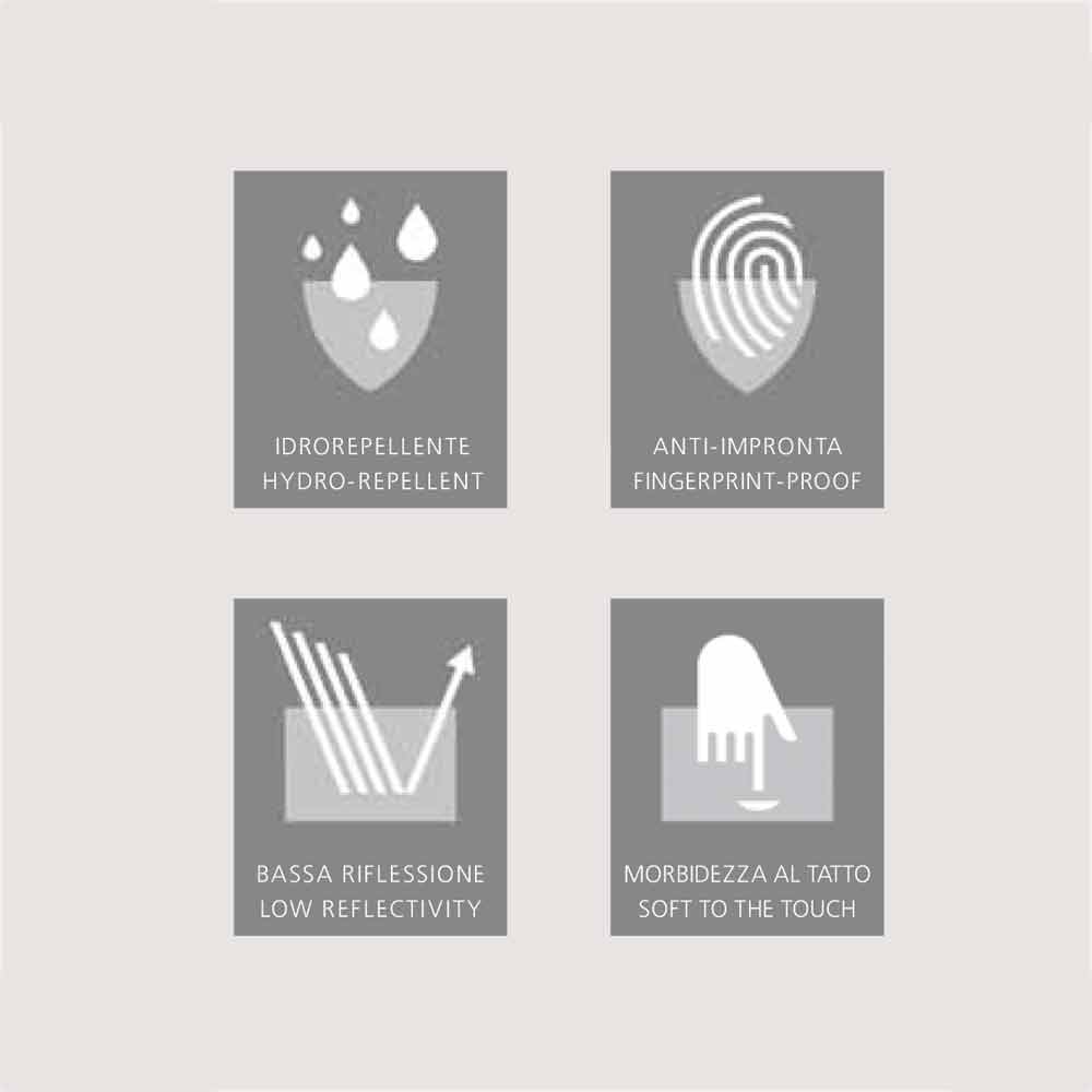 A estrutura do gabinete é feita de Fenix, um material polimérico tratado com técnicas nanotecnológicas, que torna a superfície impermeável, repelente à mancha e com um efeito de toque suave. Fornecido com interruptor e tomada.