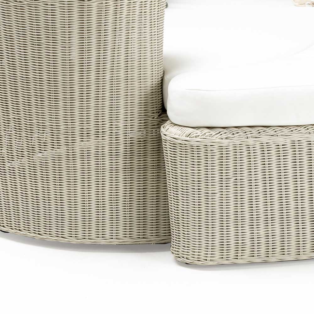 A estrutura desta espreguiçadeira ao ar livre é feita com um alumínio revestido a pó quadro , no qual a fibra de alta qualidade de 3 mm de espessura da marca Rehau Polyrattan é tecida à mão . As almofadas de assento e costas incluídas na cor branca padrão.