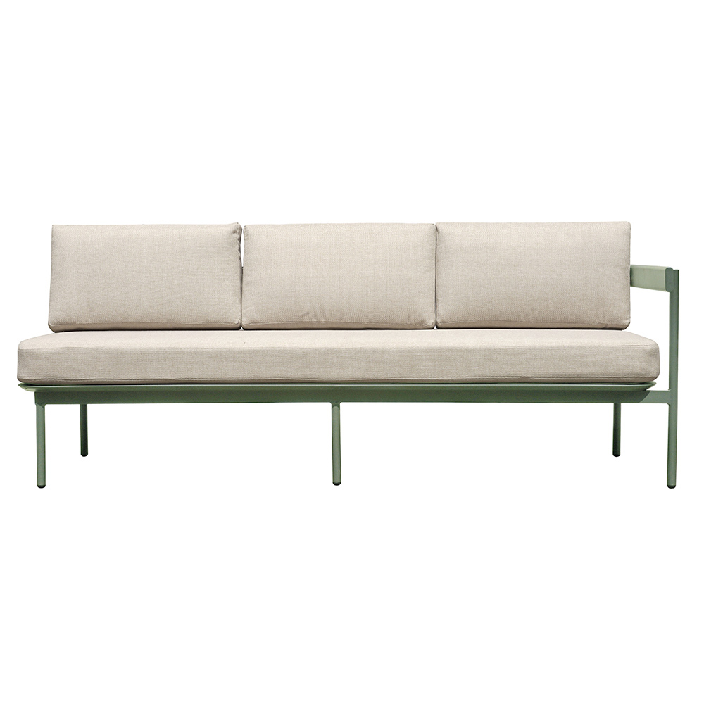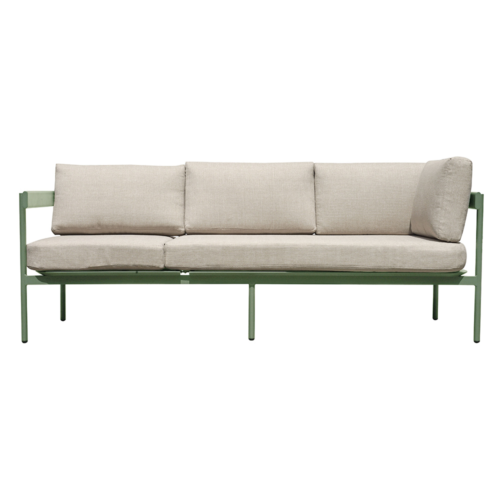 Conjunto de lounge para área externa incluindo 2 sofás de 3 lugares , um dos quais se converte em uma espreguiçadeira com encosto ajustável, feito com uma estrutura de alumínio verde e almofadas removíveis cor de areia e três travesseiros decorativos. Também está incluída uma mesa de centro com um tampo de ripas e estrutura de alumínio verde.