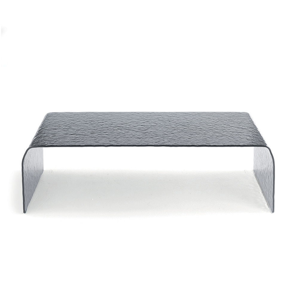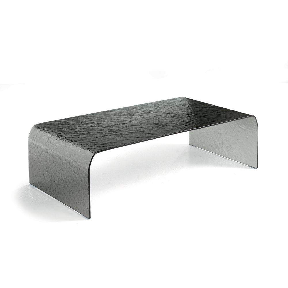 Criada a partir de uma única folha de vidro transparente curvado , esta mesa de centro apresenta um acabamento martelado refinado que cria uma delicada interação de reflexos e profundidade. A forma contínua e sem emendas realça a pureza do material, transformando a mesa em um objeto verdadeiramente escultural.