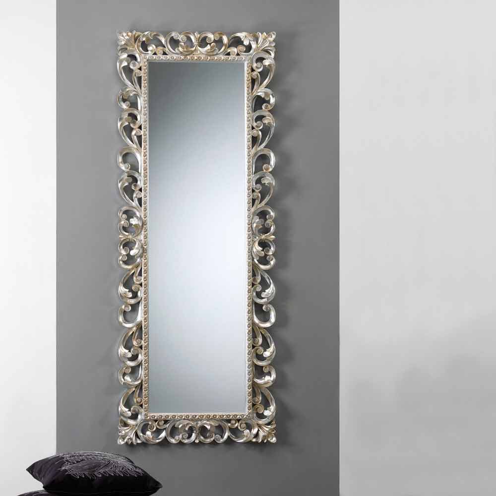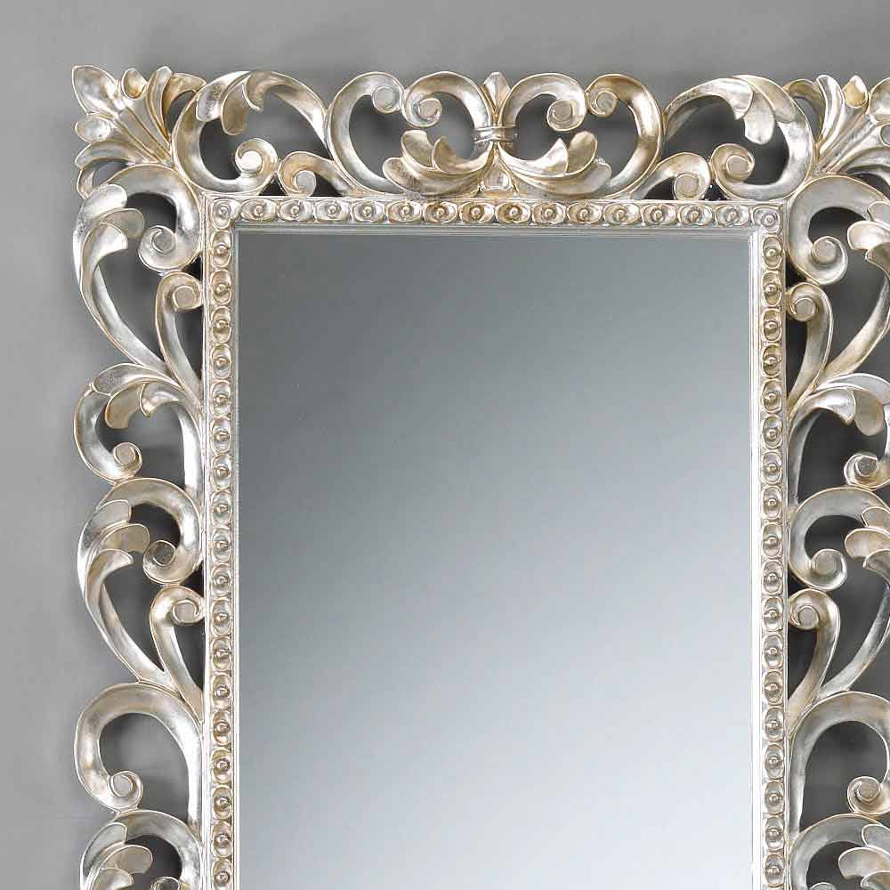 O espelho parisiense é caracterizado por um trabalho artesanal realizado com materiais de qualidade e com a experiência de habilidosos artesãos italianos. A moldura é feita de madeira decorada com esculturas. Acabamento em folha de prata. Espelho de cristal chanfrado com 4 mm de espessura. Feito na Itália. Para pendurar verticalmente e horizontalmente.