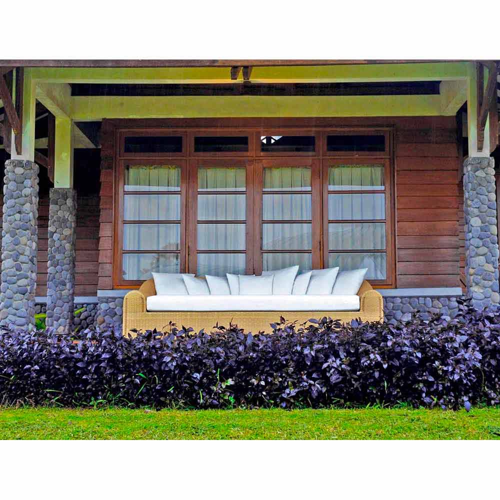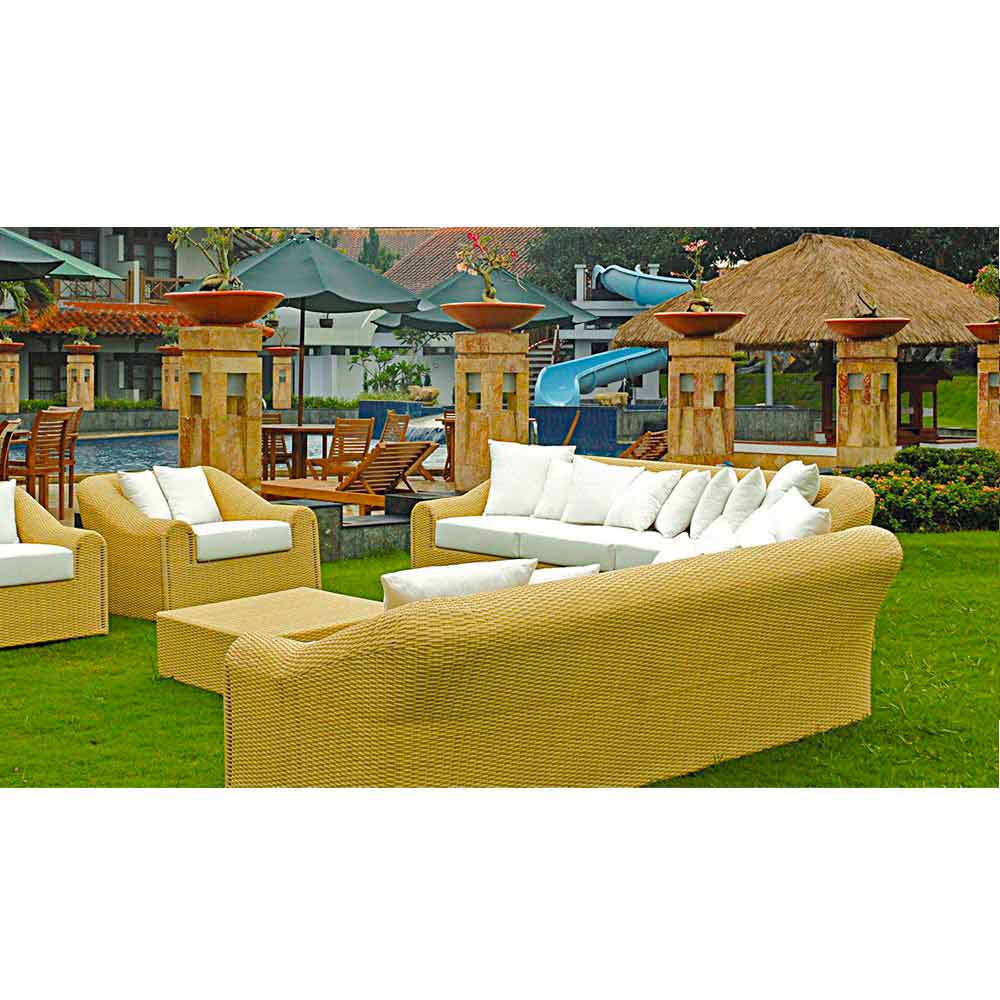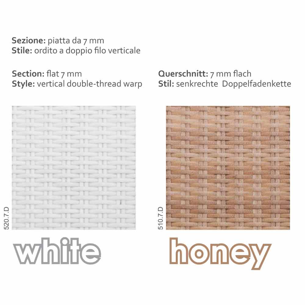 Sofá de jardim com moldura de alumínio revestida com polietileno plano de 7 mm de espessura, disponível nas tonalidades branco ou mel.
