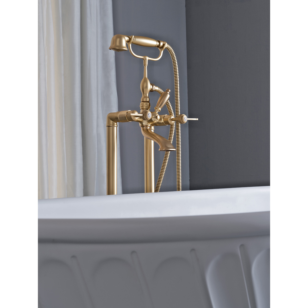 Conjunto de banheira de chão com duche de mão e flexível, fabricado em latão pesado, fundido em moldes que respeitam os sistemas artesanais do passado e protegido com uma espessa camada de acabamento latão mate.