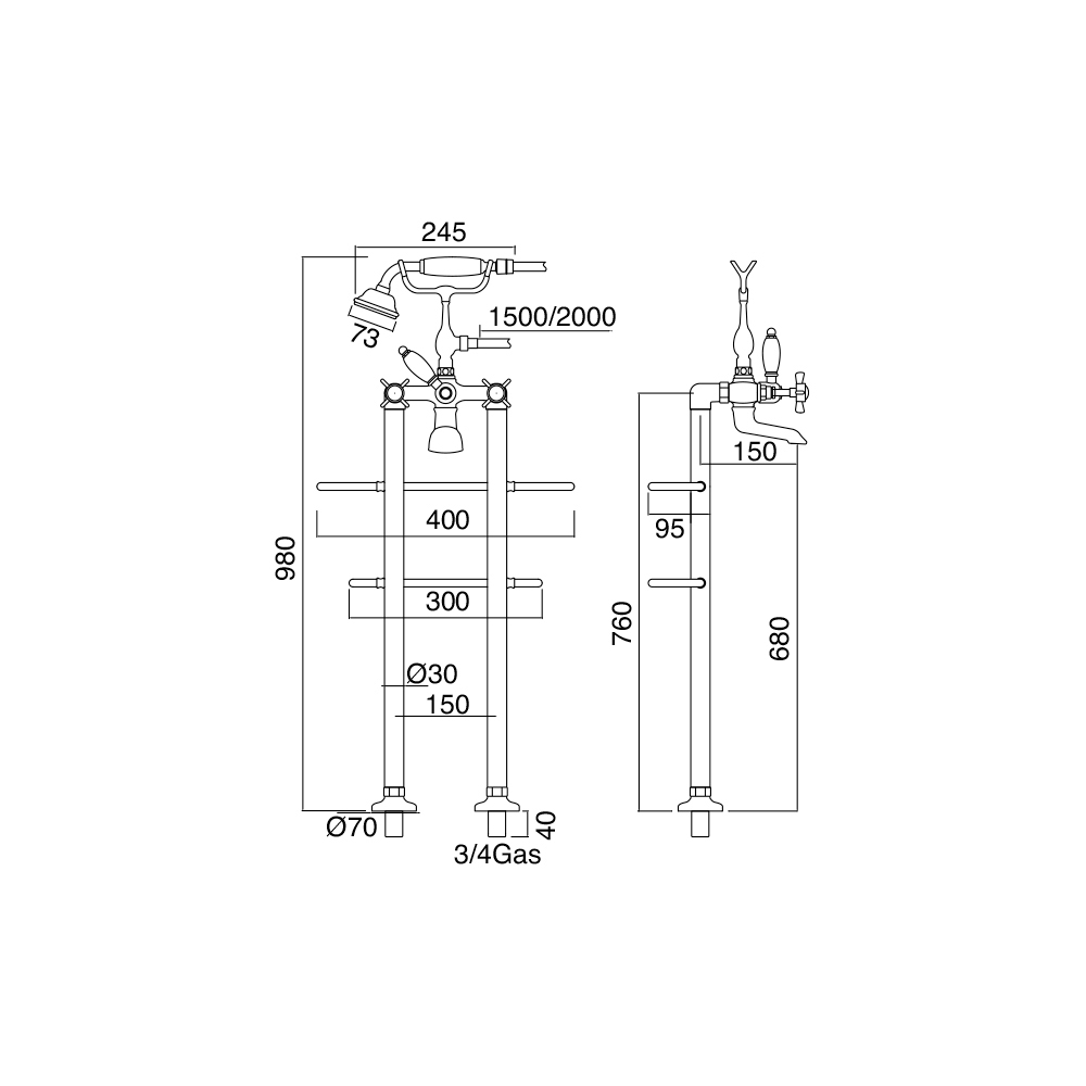 conjunto de banheira de chãocom toalheiro, chuveiro de mão e mangueira.