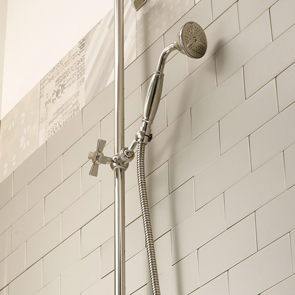 grupo de duche com calha deslizante, braço e chuveiro, feito em latão.