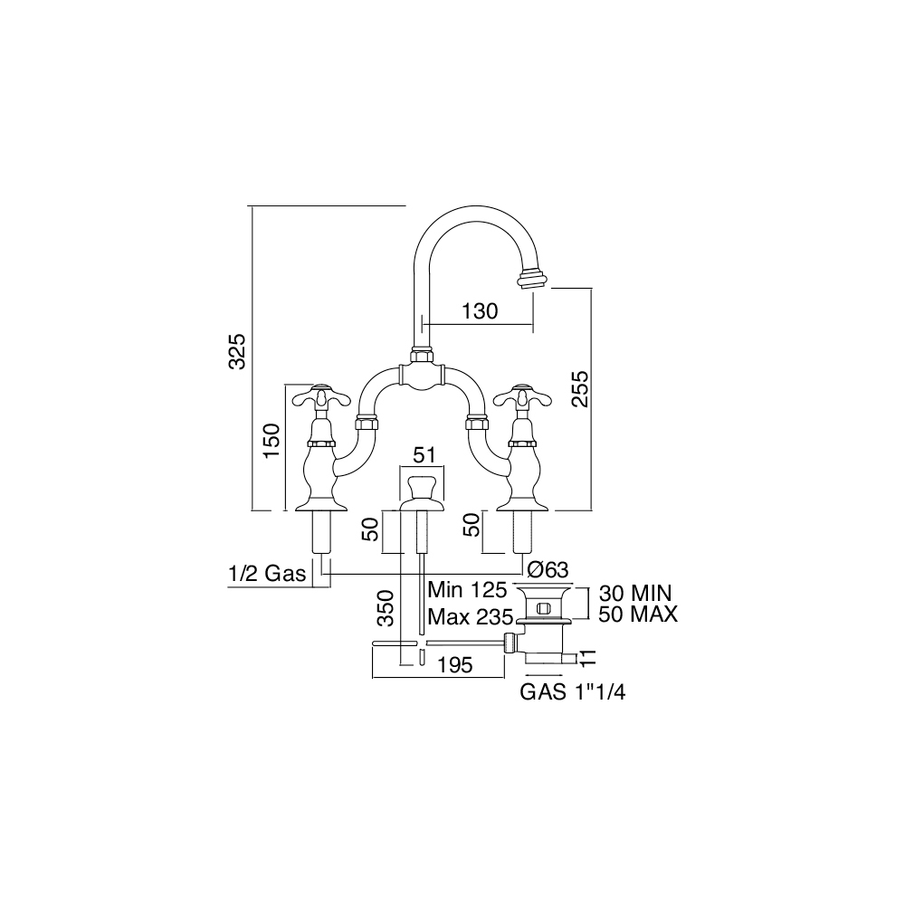 ponte de 2-3 furos com dreno, distância central ajustável e bico articulado.