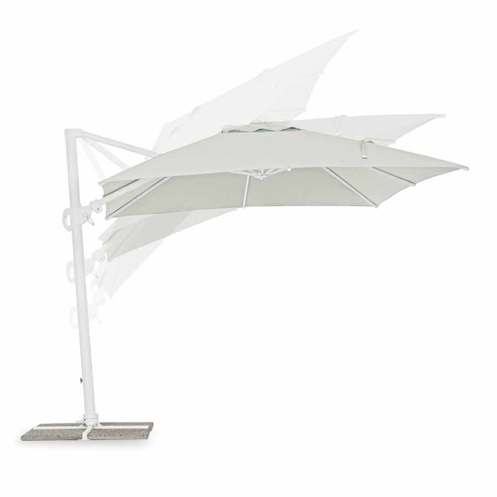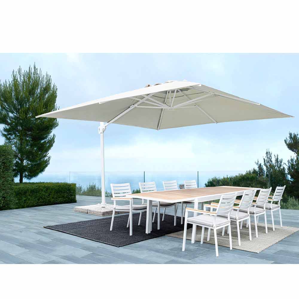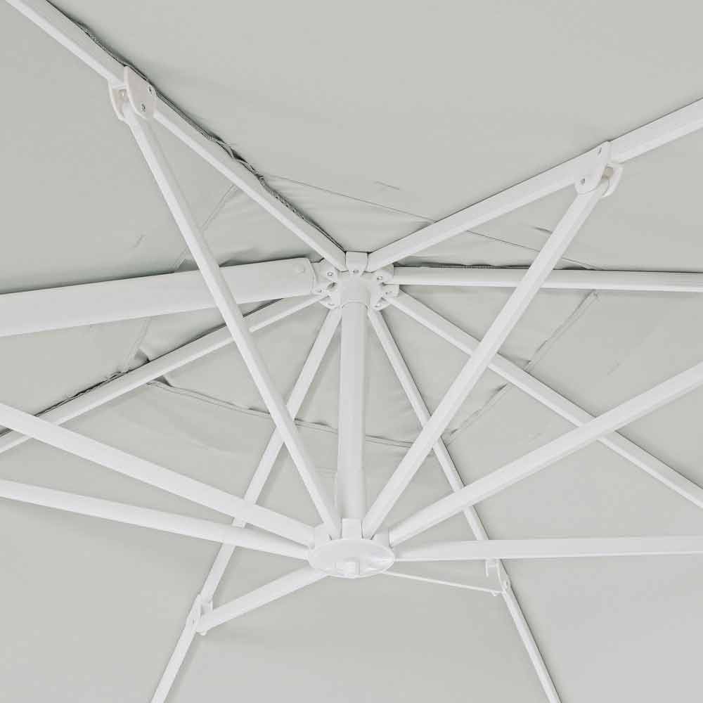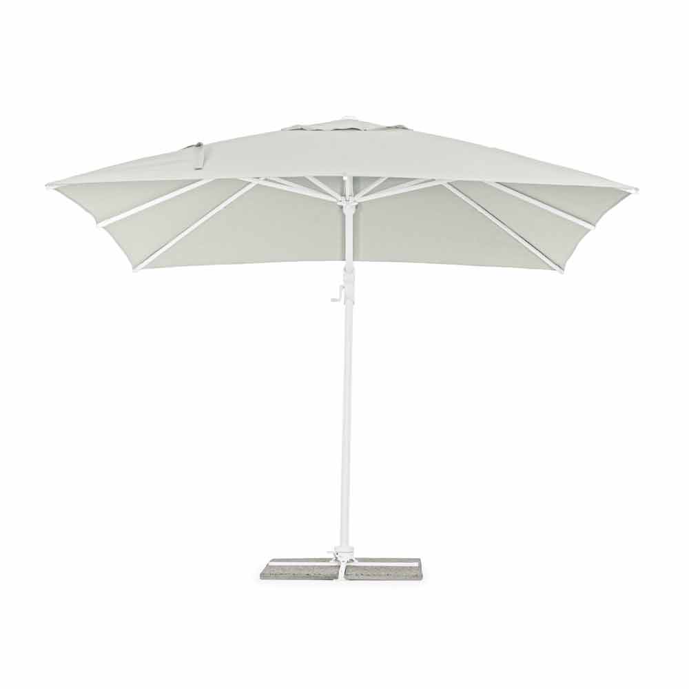 Estrutura em alumínio com revestimento em pó (poliéster). Poste 90x60mm, 8 nervuras 25x17mm, tecido poliéster natural 250gr / m2 com revestimento de pa (poliamida), base cruzada de aço, poste giratório 360 ° com pedal. Inclinação vertical com manípulo de 6 posições, equipado com sistema de inclinação direita-esquerda para guarda-chuva.