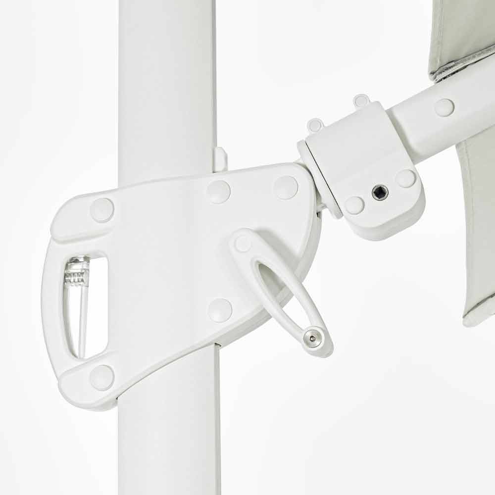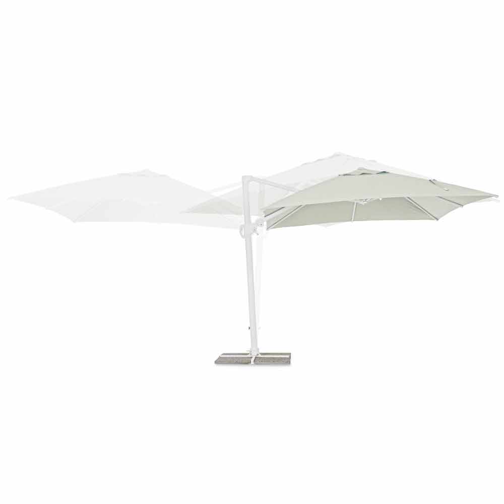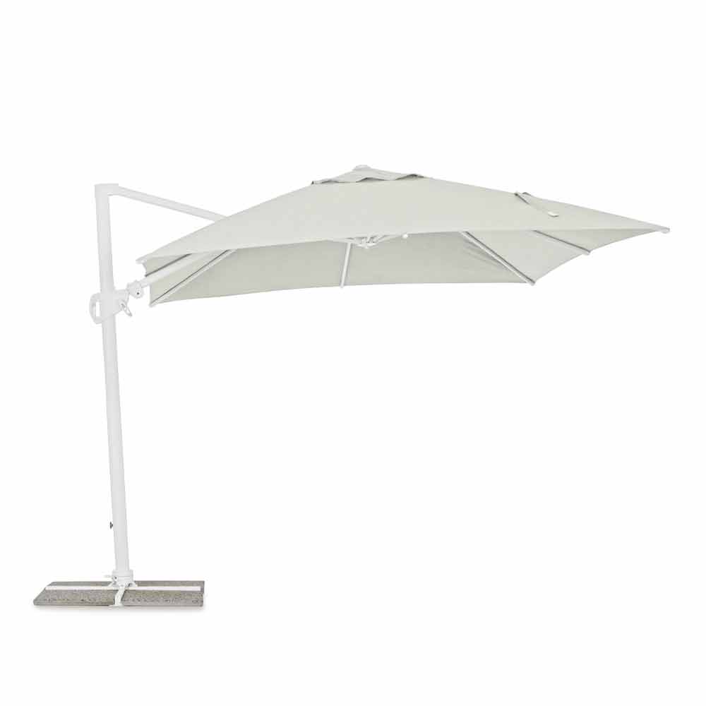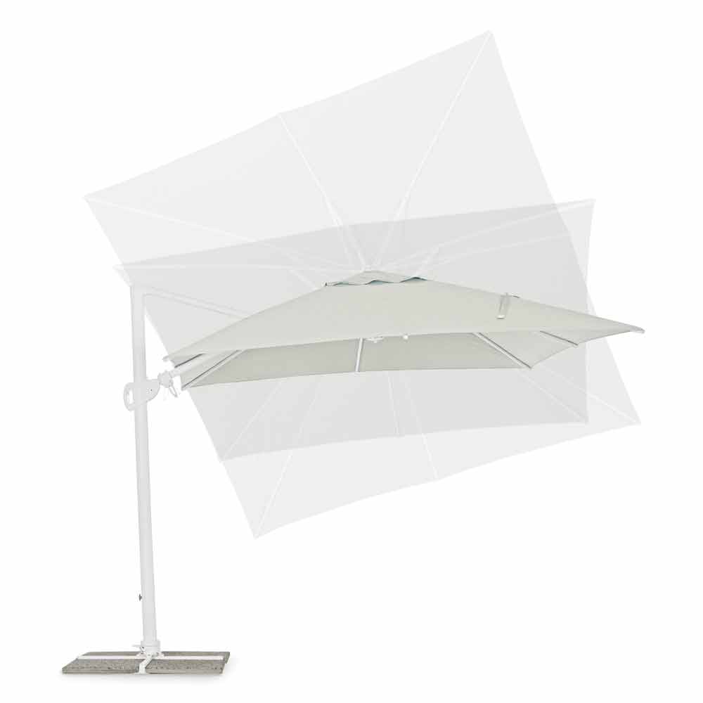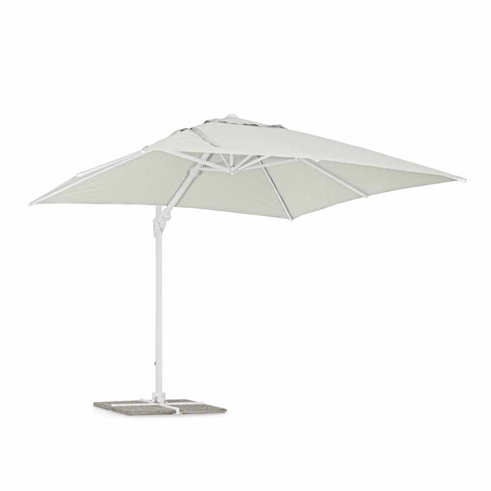 Estrutura em alumínio com revestimento em pó (poliéster). Poste 90x60mm, 8 nervuras 25x17mm, tecido poliéster natural 250gr / m2 com revestimento de pa (poliamida), base cruzada de aço, poste giratório 360 ° com pedal. Inclinação vertical com manípulo de 6 posições, equipado com sistema de inclinação direita-esquerda para guarda-chuva.