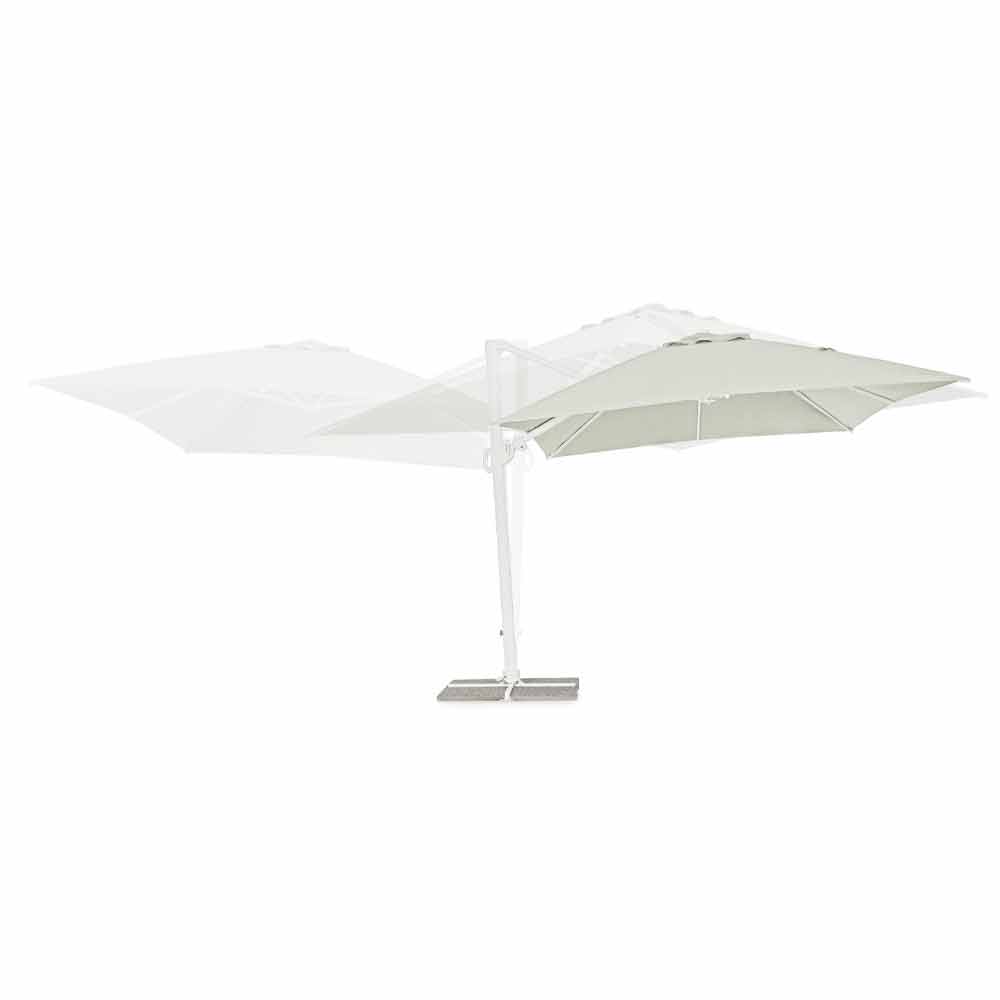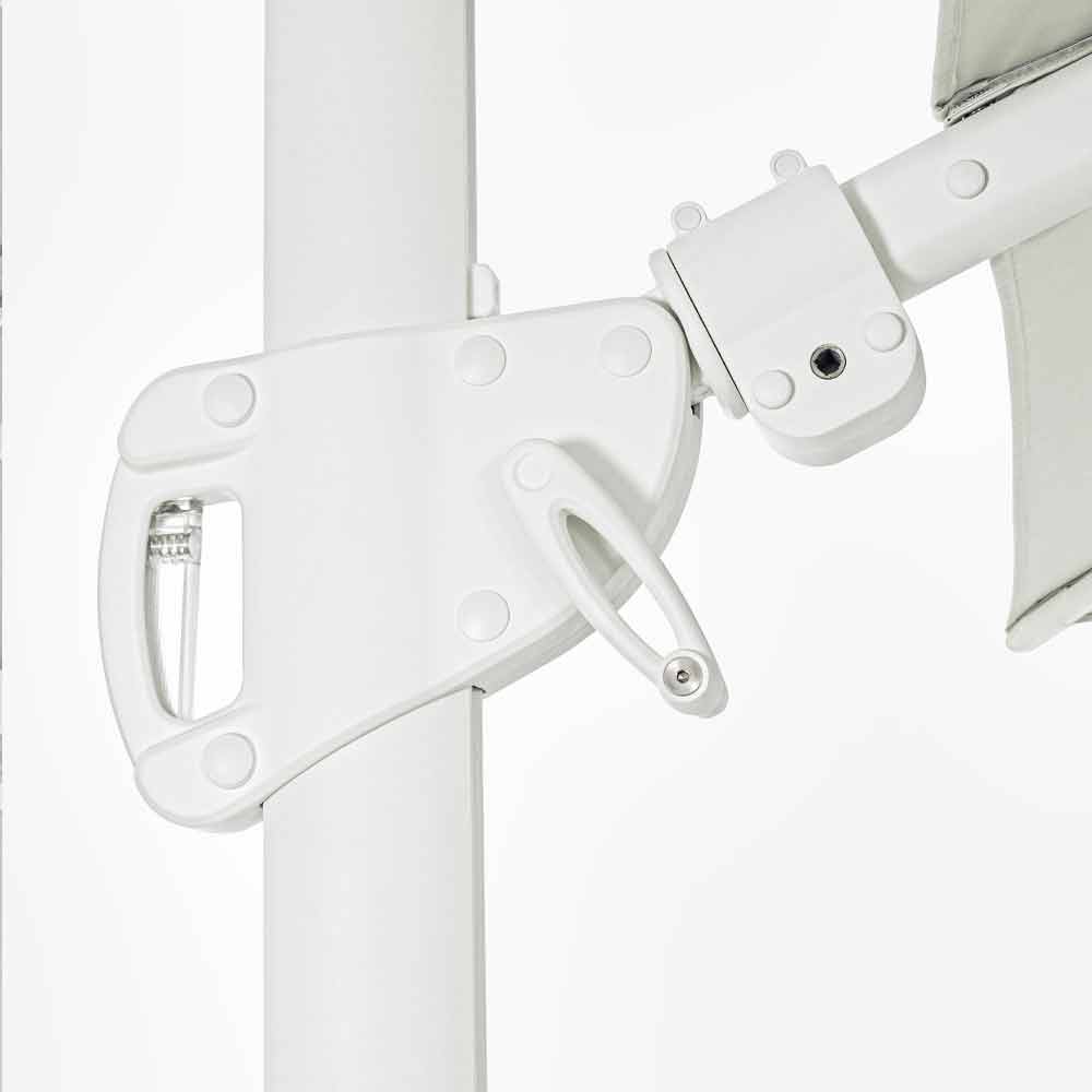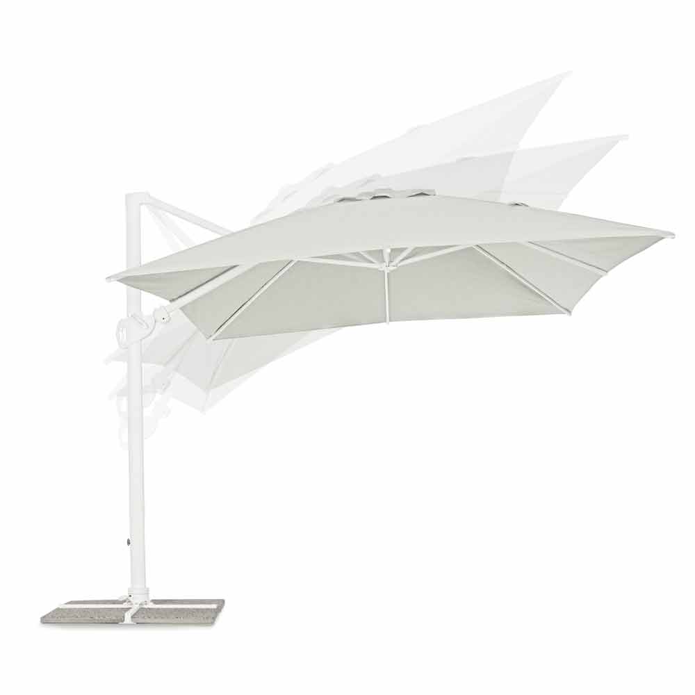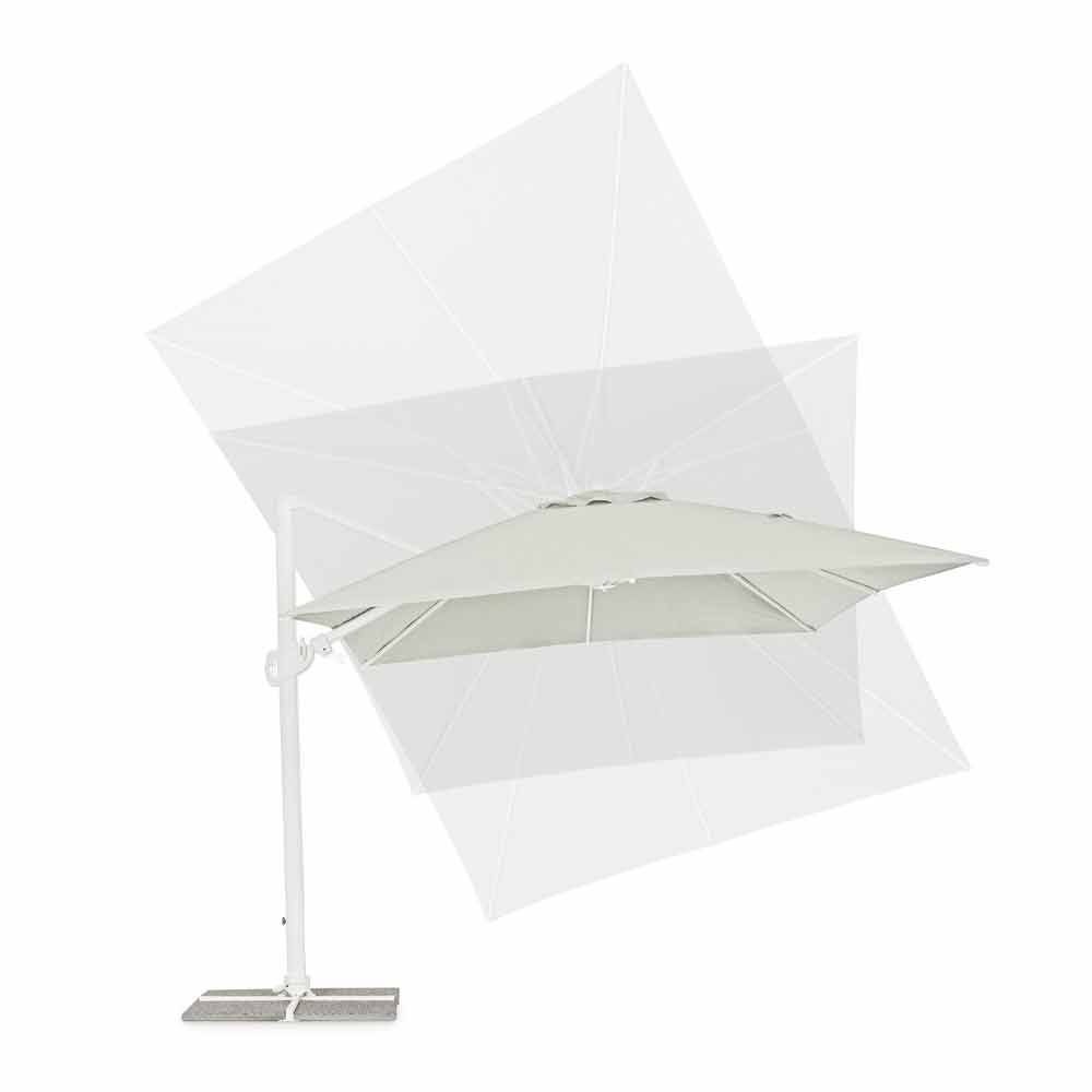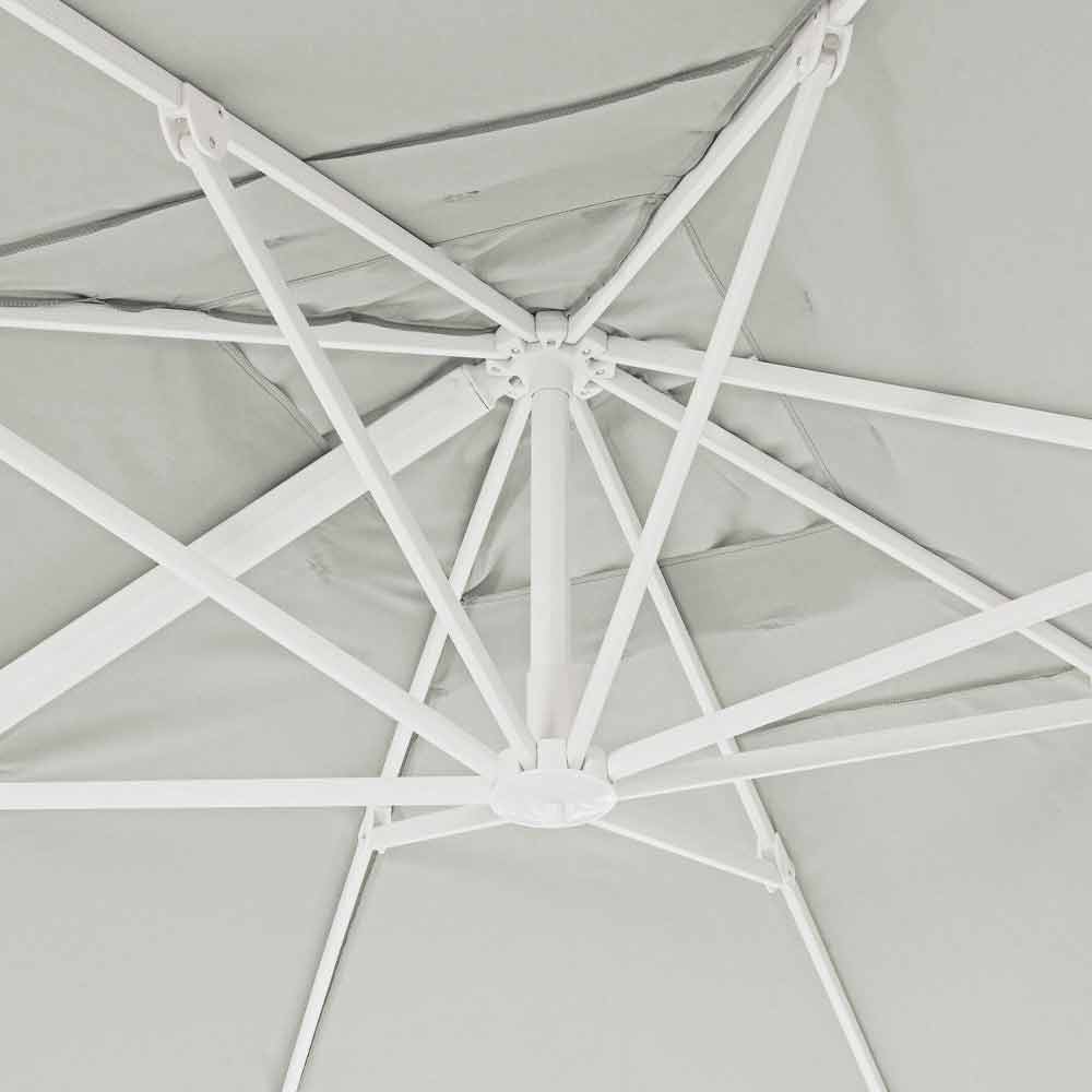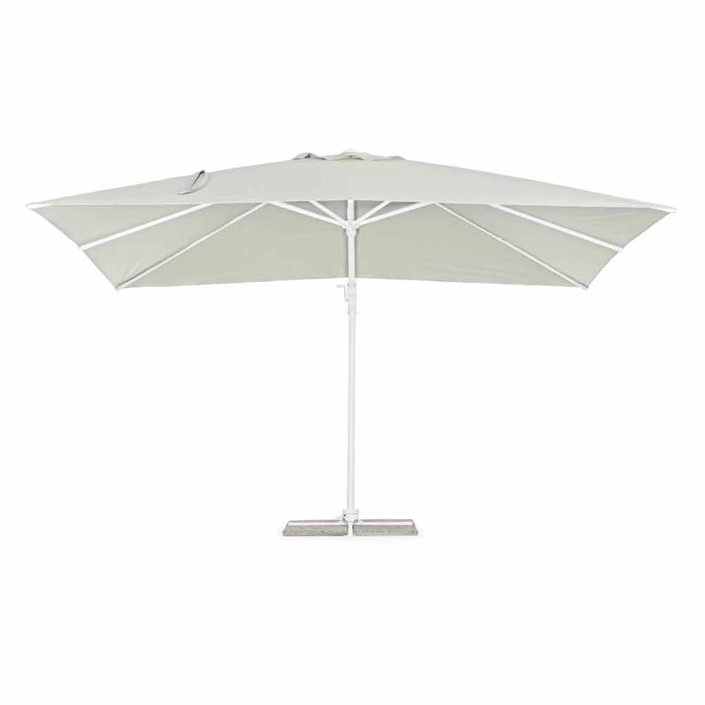 Estrutura em alumínio com revestimento em pó (poliéster). Poste 90x60mm, 8 nervuras 25x17mm, tecido poliéster natural 250gr / m2 com revestimento de pa (poliamida), base cruzada de aço, poste giratório 360 ° com pedal. Inclinação vertical com cabo de 5 posições, equipado com sistema de inclinação direita-esquerda do guarda-chuva.