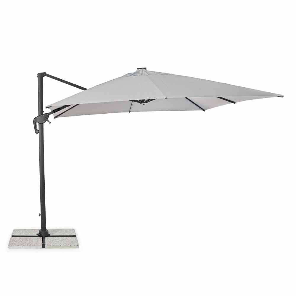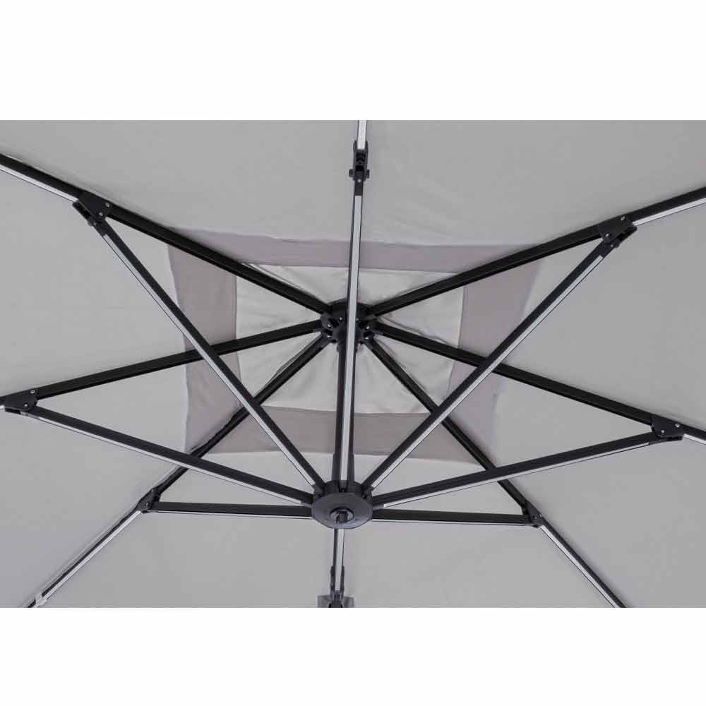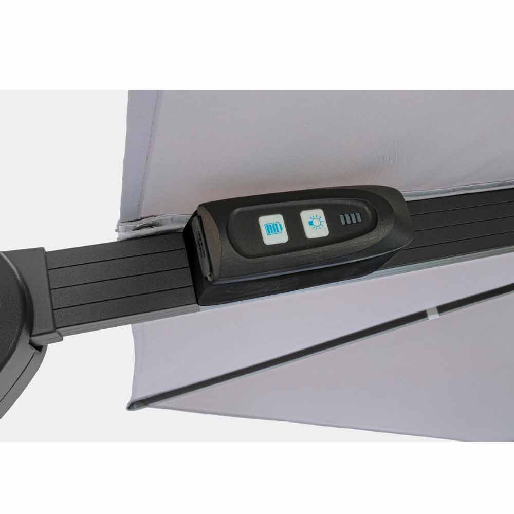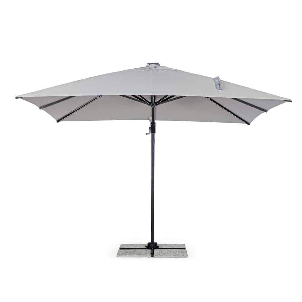 Estrutura em alumínio com revestimento em pó (poliéster). Poste 77x53mm, 8 nervuras 24x14mm com luzes led brancas recarregáveis com painel solar incluído. Tecido poliéster cinza claro 250gr / m2 com revestimento pa (poliamida). Base cruzada em aço . Poste giratório 360 ° com pedal. Inclinação vertical com alça de 4 posições. Inclui cobertura de guarda-chuva.