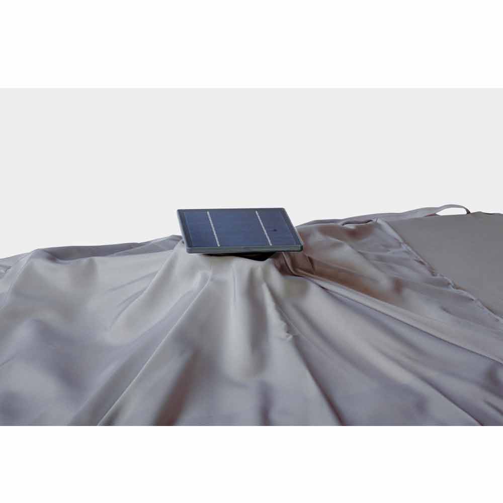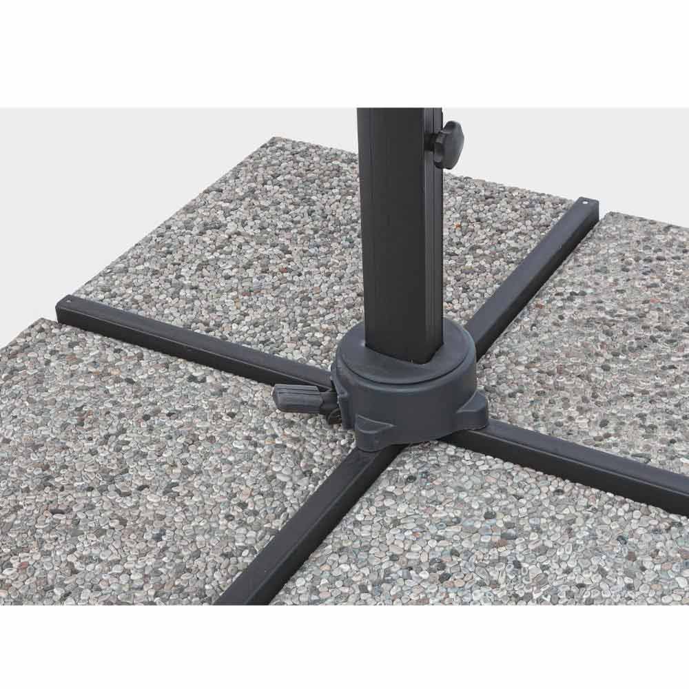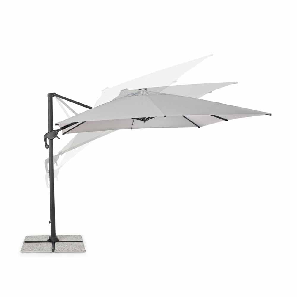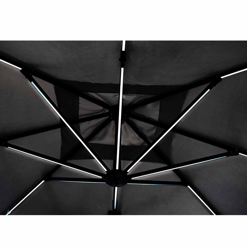 Estrutura em alumínio com revestimento em pó (poliéster). Poste 77x53mm, 8 nervuras 24x14mm com luzes led brancas recarregáveis com painel solar incluído. Tecido poliéster cinza claro 250gr / m2 com revestimento pa (poliamida). Base cruzada em aço . Poste giratório 360 ° com pedal. Inclinação vertical com alça de 4 posições. Inclui cobertura de guarda-chuva.