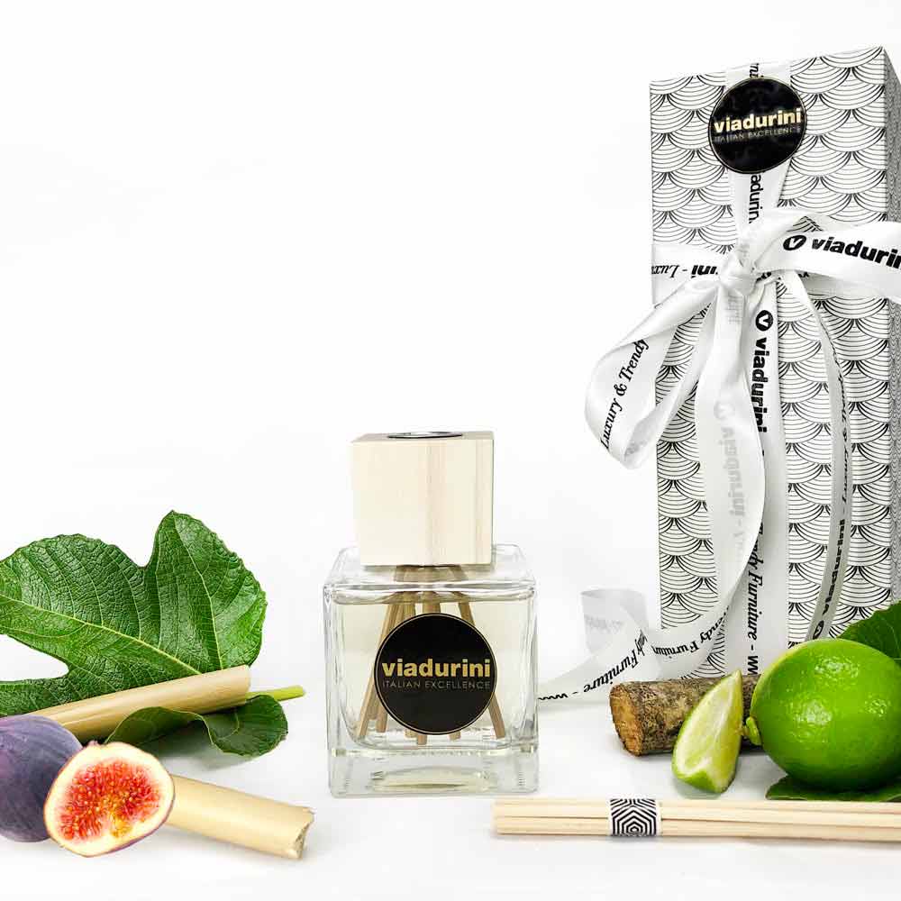 Fragrância caseira com bambu e fragrância cítrica de lima com bastões - Essência Made in Italy.