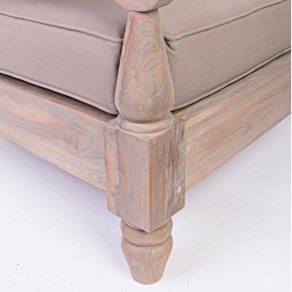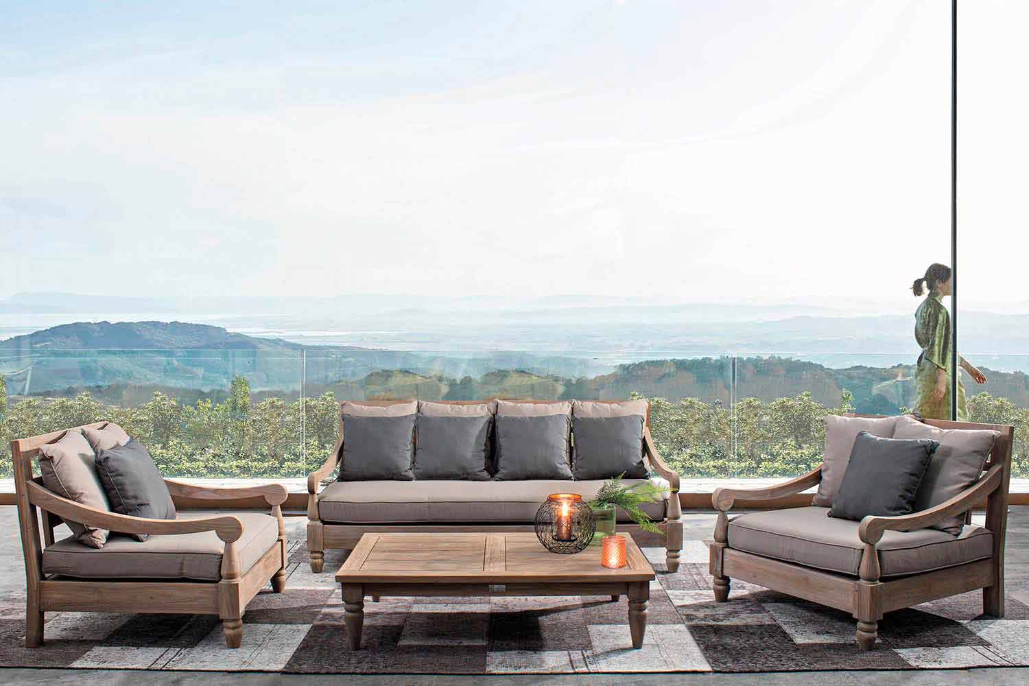 Madeira 100% teca FSC, acabamento jateado e envelhecido à base de água. Almofadas removíveis com tecido de olefina à prova de sol (100% polipropileno).