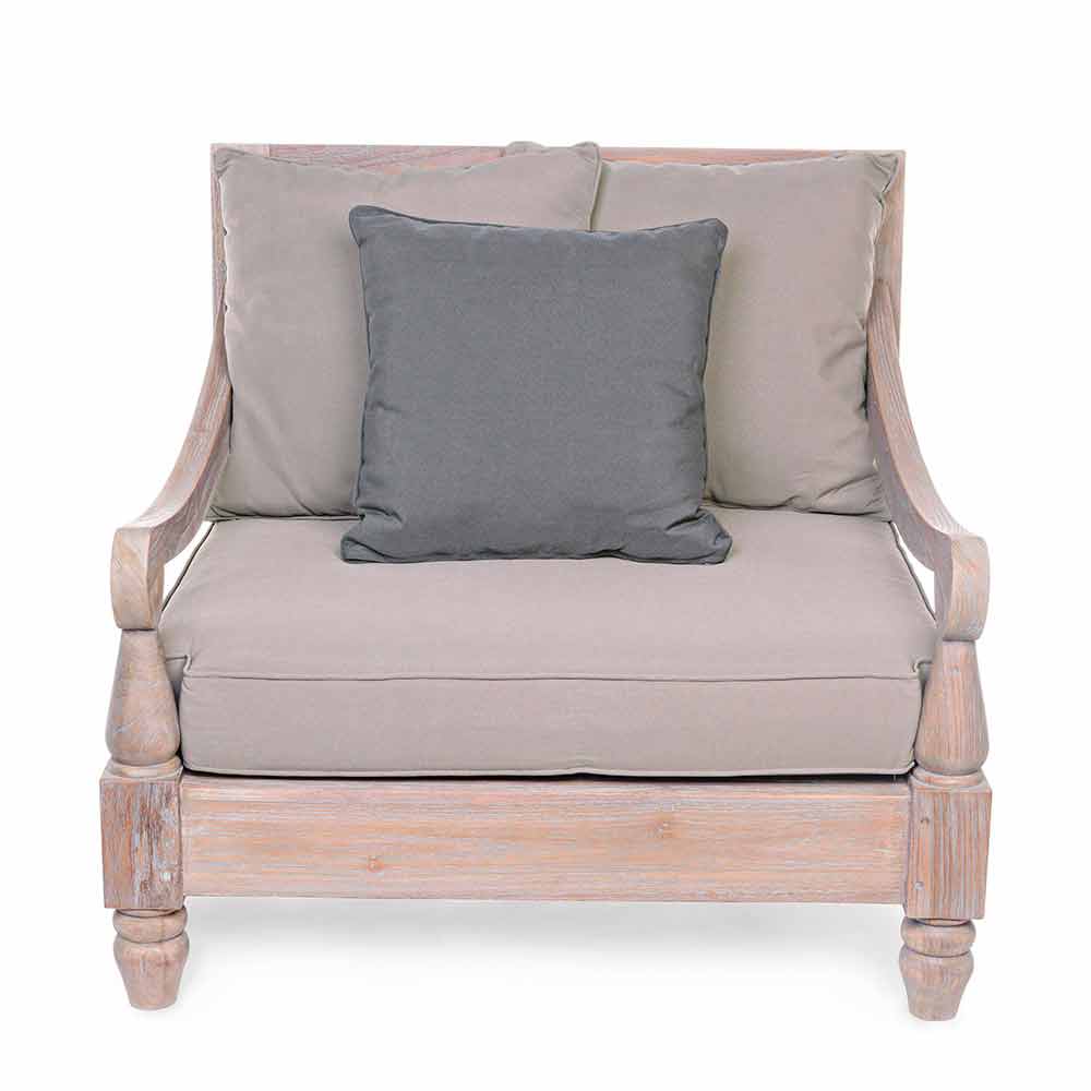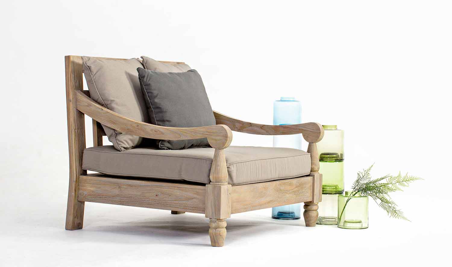 Poltrona de exterior em estilo rústico, feita de madeira de teca, com almofadas de tecido removível.