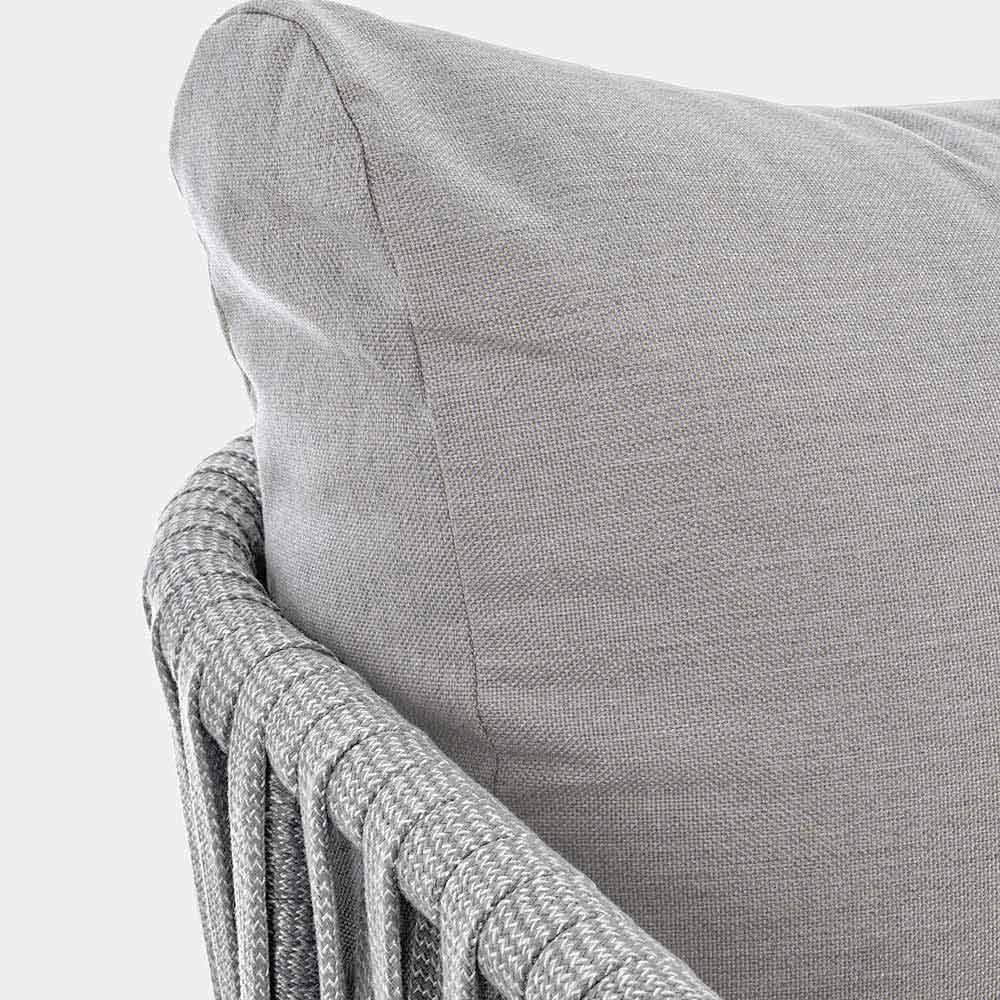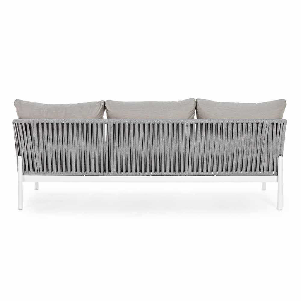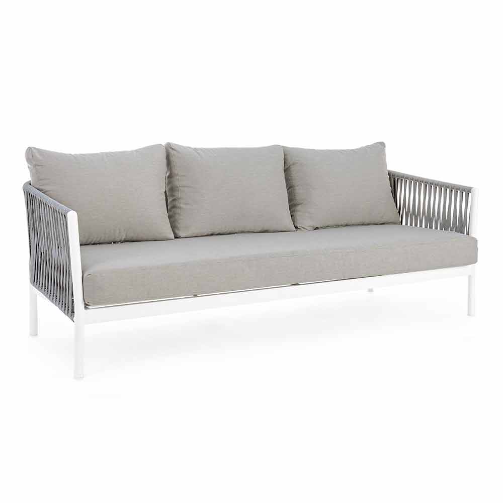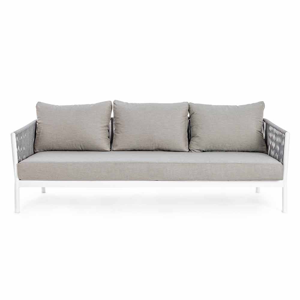 Sofá exterior de design moderno em alumínio branco com tecido de corda e almofadas cinzas.