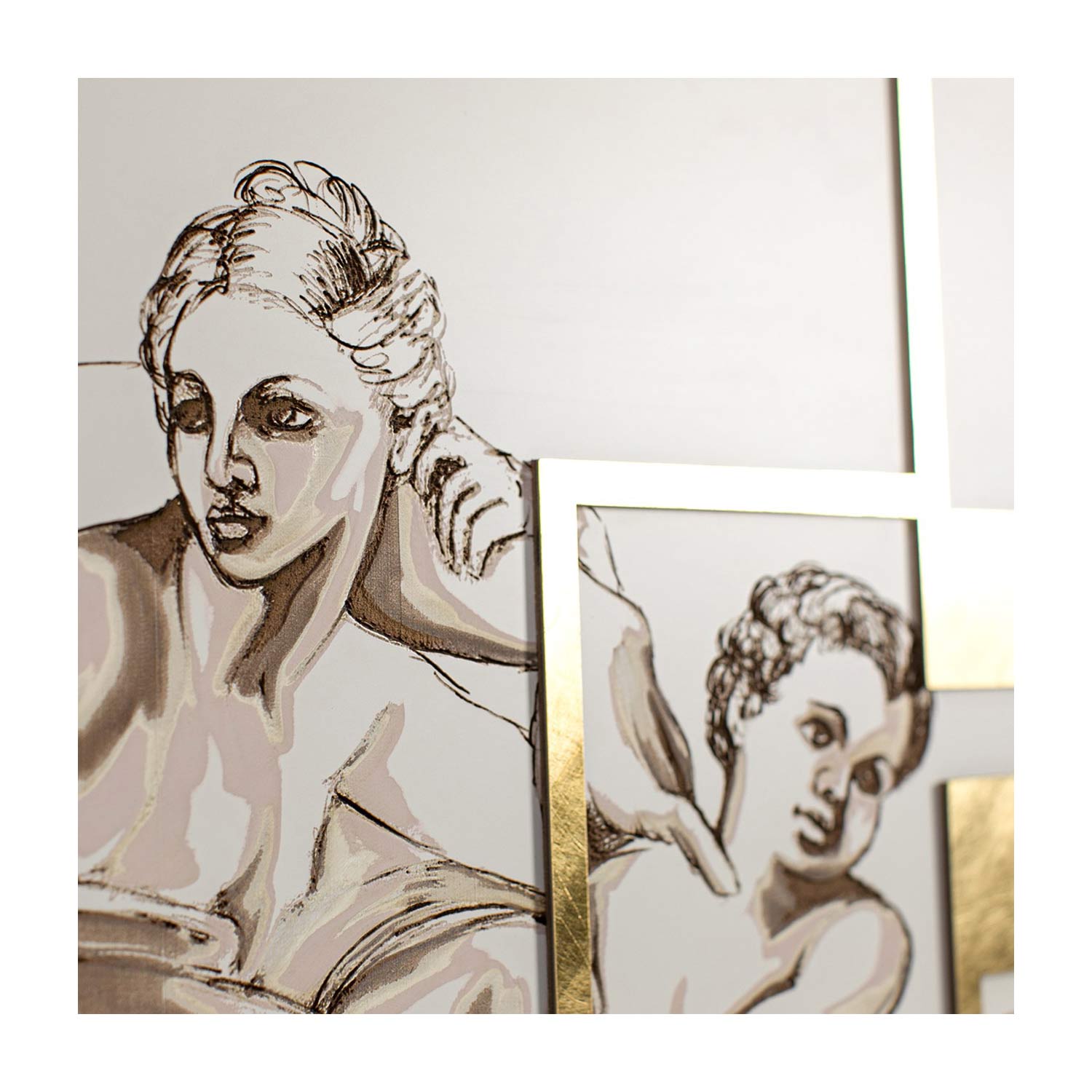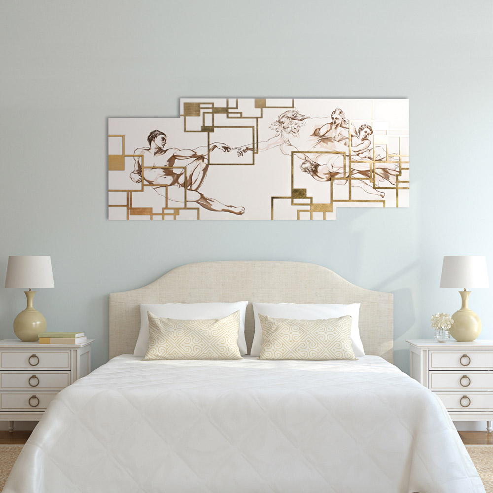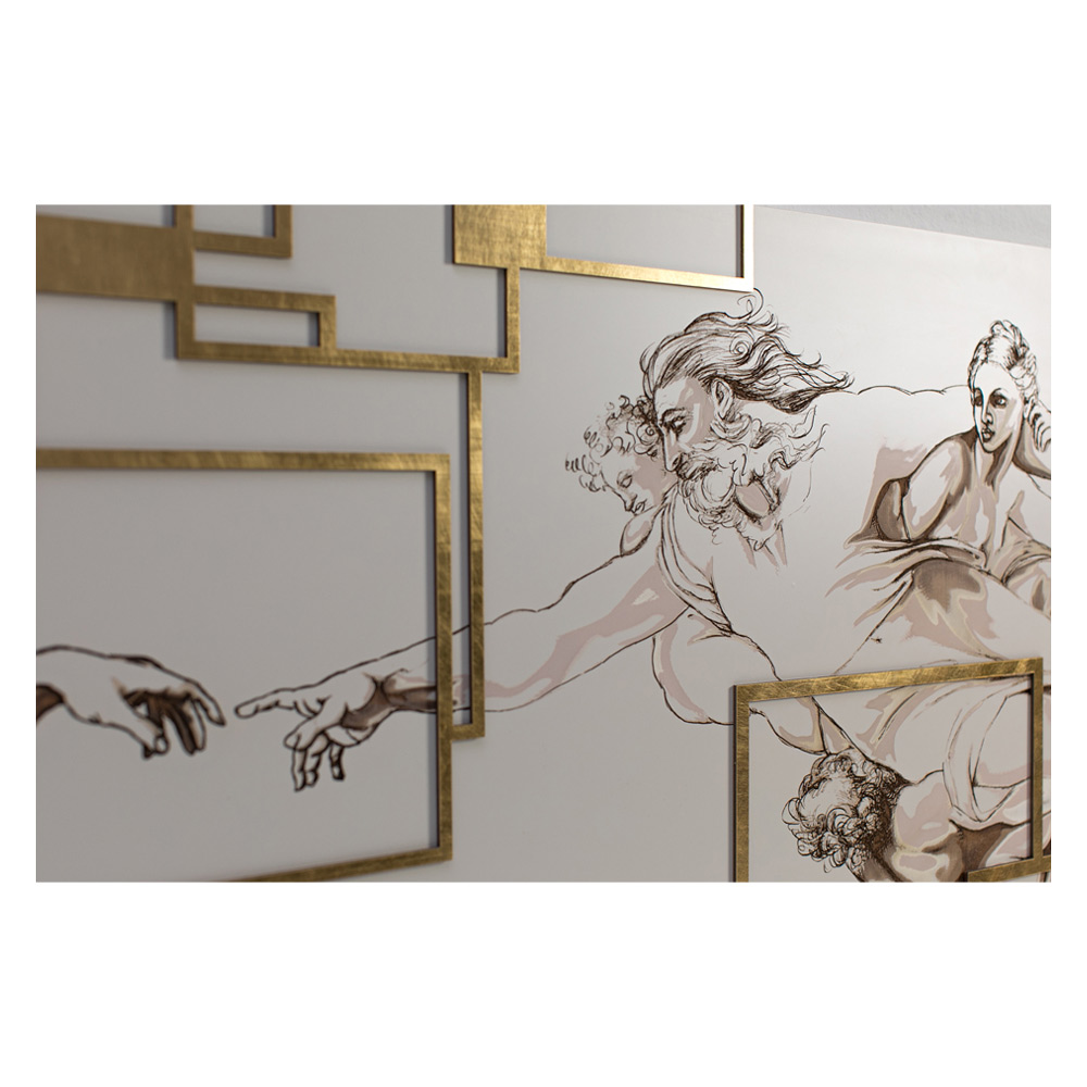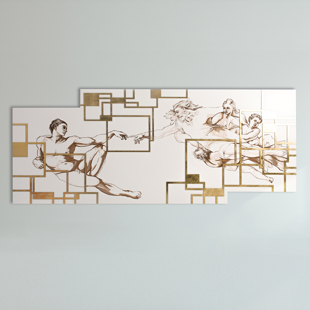 O painel é uma cabeceira única representando a peça central do afresco de Michelangelo na Capela Sistina, "A Criação de Adão" . O afresco é habilmente relatado nos mínimos detalhes graças à marcação a laser que cria nuances de cor e profundidade . Estrutura em madeira lacada a branco mate com marcação a laser, técnica especial que cria um baixo-relevo nos materiais.