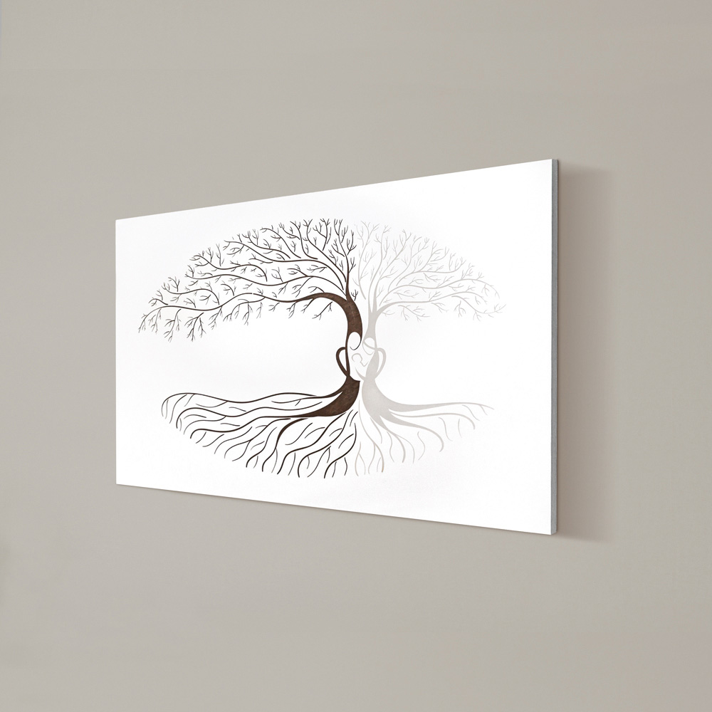 Painel de decoração que representa a união de dois troncos em um abraço familiar, símbolo da vida.