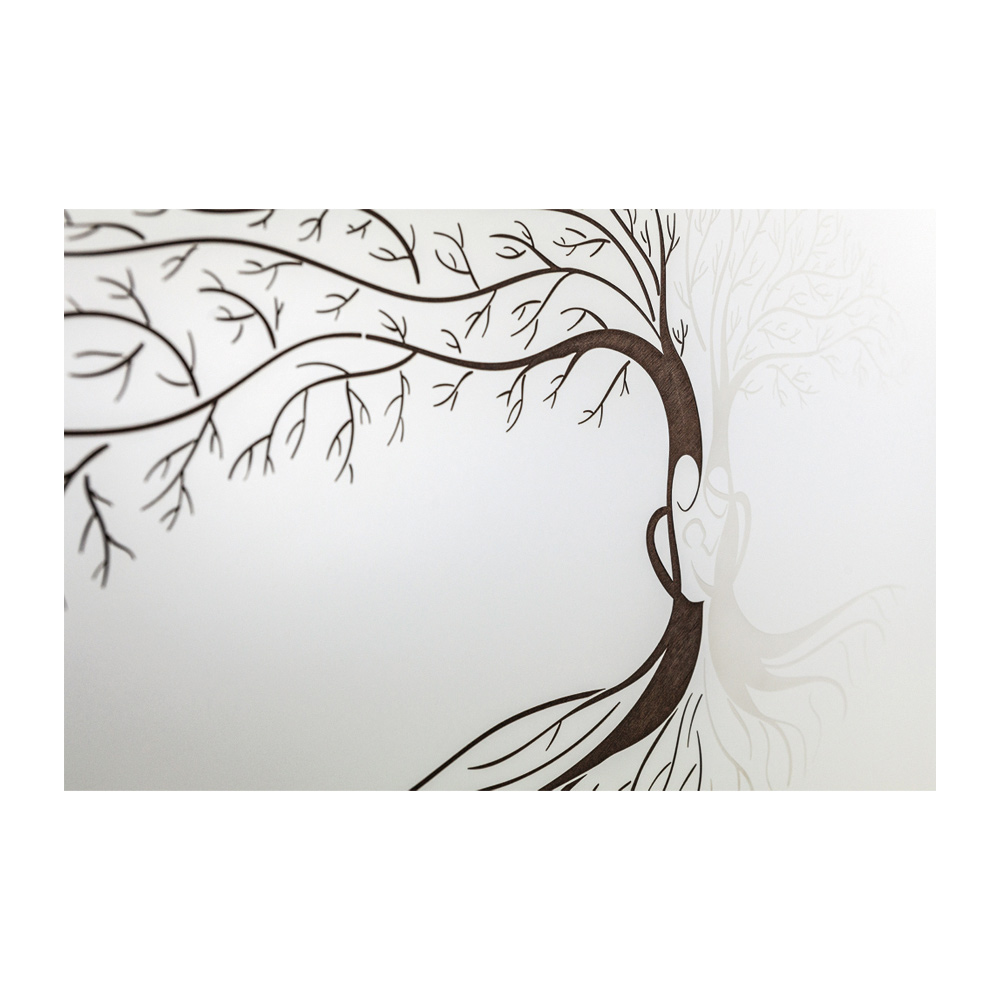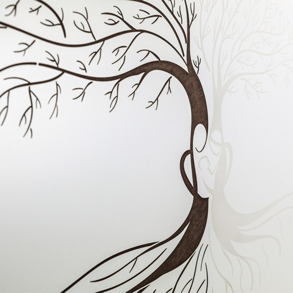 Ramos e folhas feitos com marcação a laser se ramificam do tronco. Estrutura em madeira lacada a branco mate com aplicações em madeira lacada a duas tonalidades e marcação a laser.