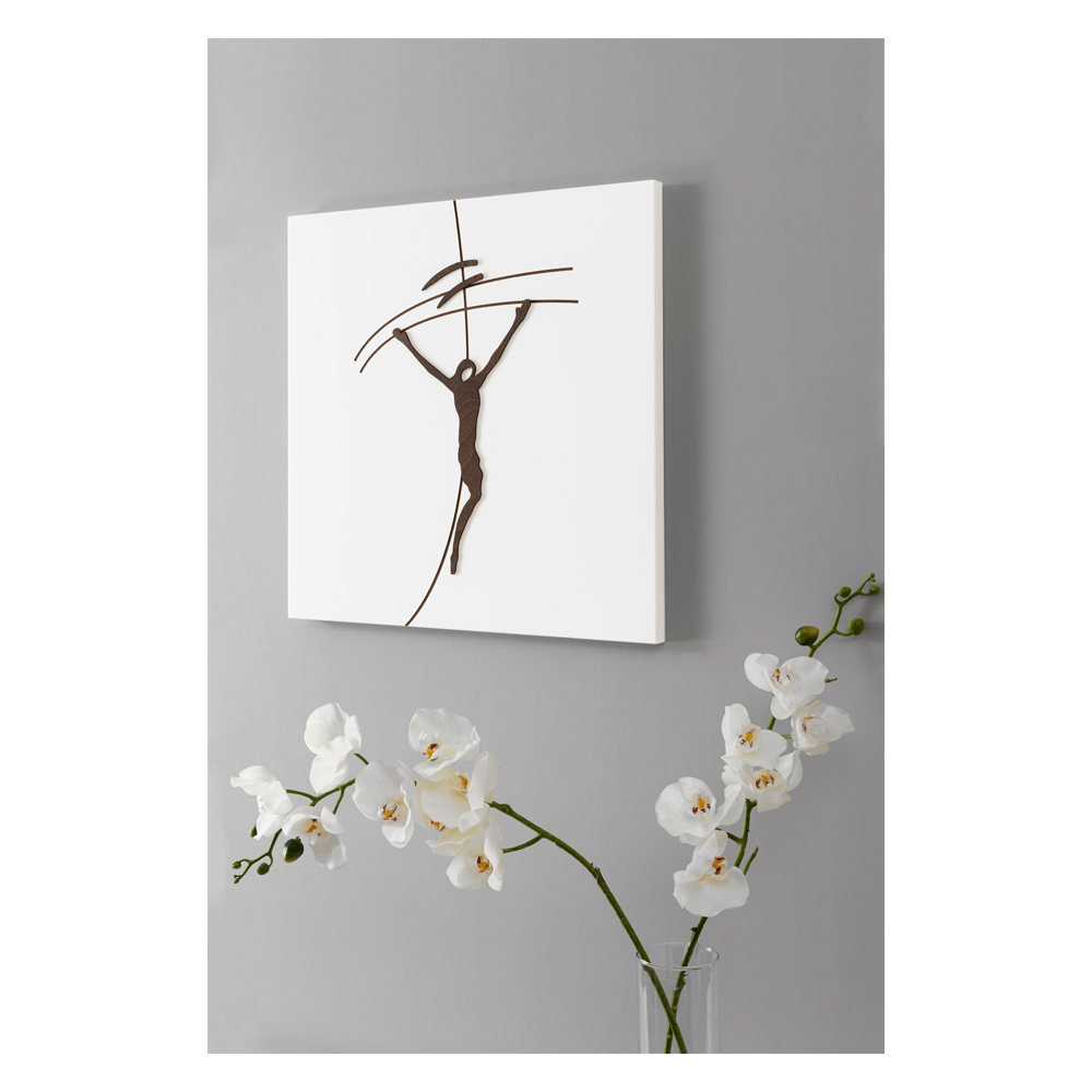 Quadro em madeira lacada com gravação a laser da cruz estilizada e aplicação de Jesus.