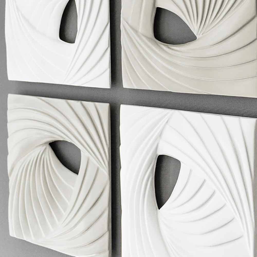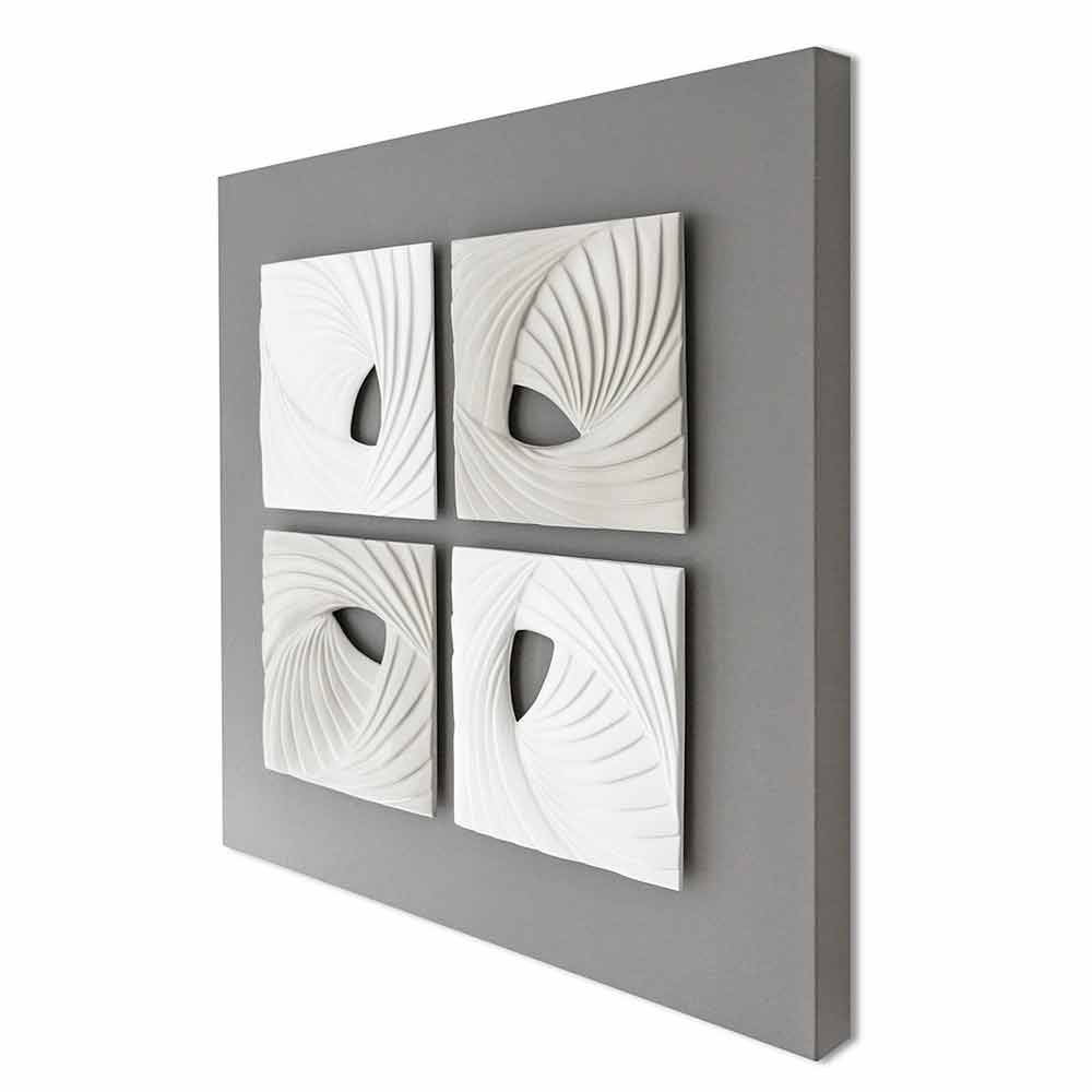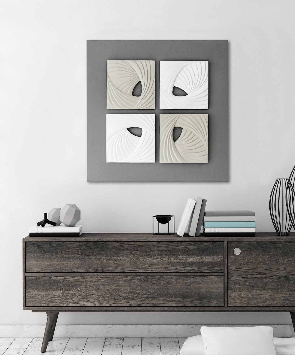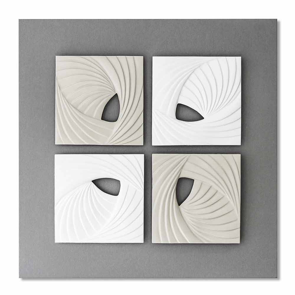 em cerâmica composta é composta por quatro elementos com linhas elegantes e formas modernas em branco marfim e cinza seda, pendurados sobre tela lacada cinza pedra. O resultado é um impacto estético mínimo e decorativo, para um estilo único.
