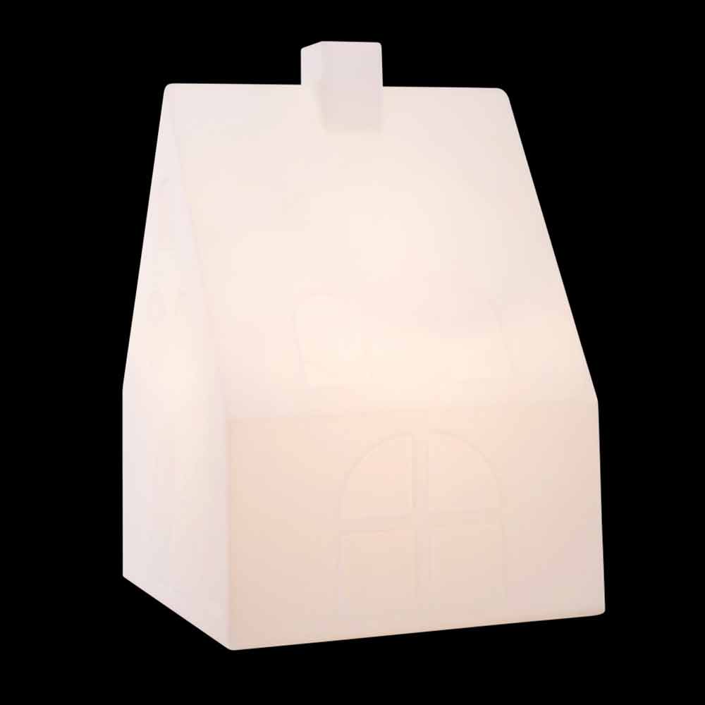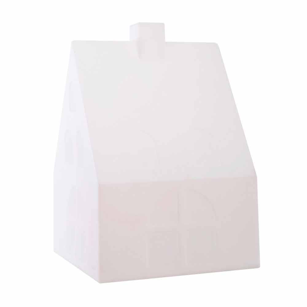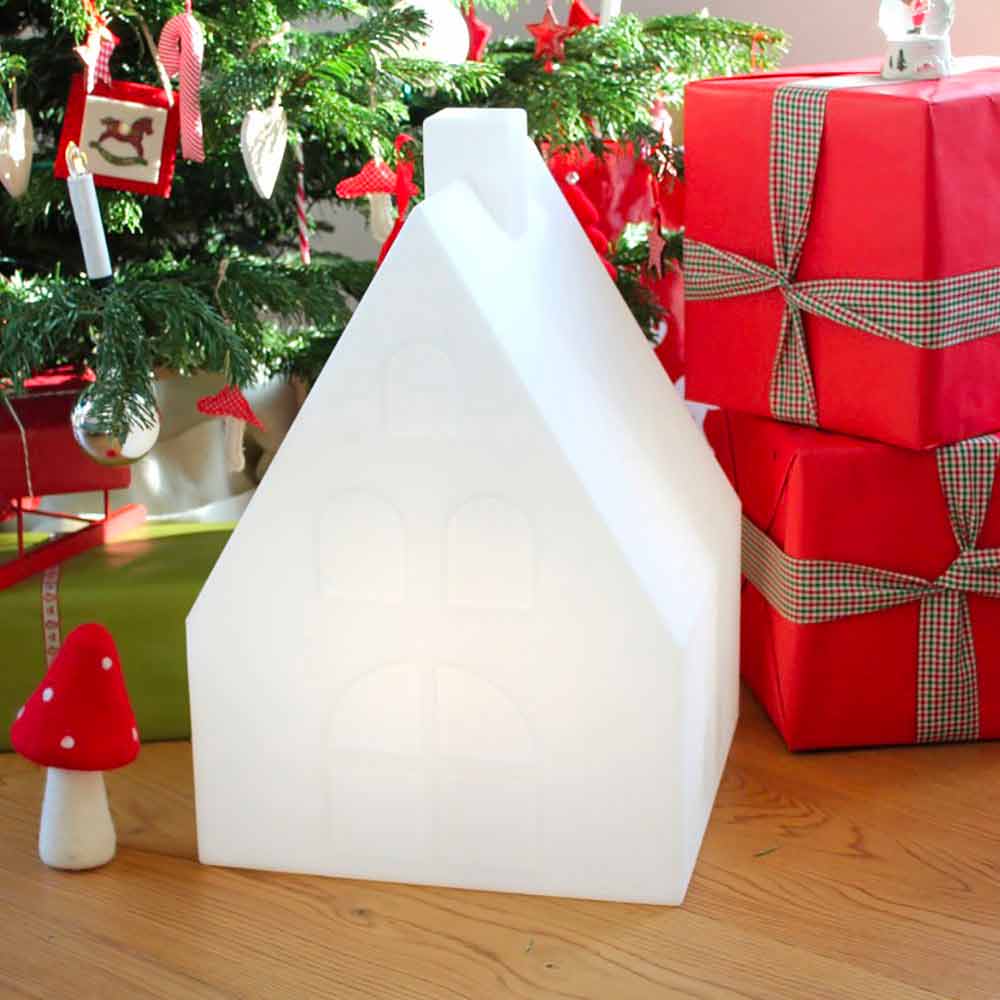 Luminária de pé em forma de casa em polietileno branco, ligação LED multicolorida, solar ou E27 para interior ou exterior.