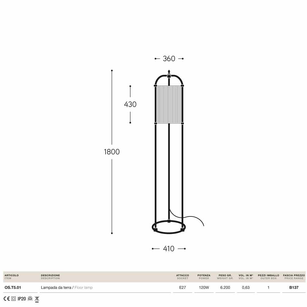 Lâmpada de assoalho moderna Huà Hikà feita de latão e tecido, trabalhada na Itália