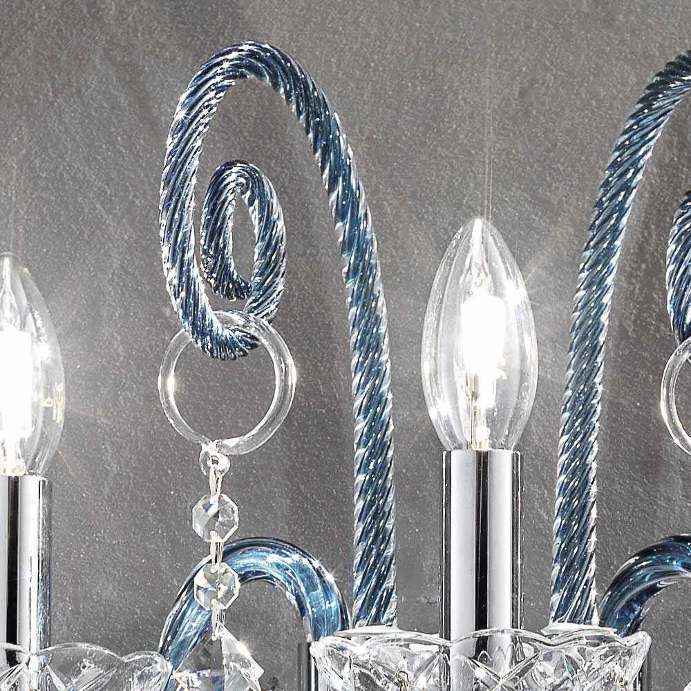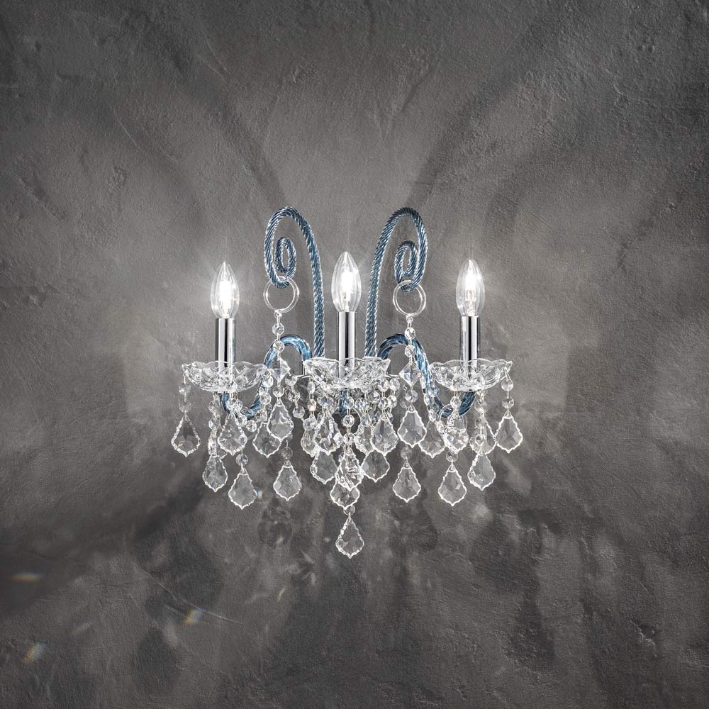Candeeiro de parede de 3 luzes feito à mão em vidro veneziano com acabamento denim com pingentes de chumbo e detalhes em metal cromado polido . Caracterizado pelos maravilhosos braços trabalhados à mão através da técnica de torção que cria um resultado exclusivo que lembra esteticamente o entrelaçamento de uma corda, este candeeiro confere personalidade a todo o ambiente envolvente. Uma verdadeira chuva de luz invade a estrutura do candelabro e depois se espalha pelo ambiente circundante por meio de refração através da magia de lantejoulas e pendentes de cristal com finos acabamentos, criando assim um efeito cenográfico evocativo e onírico capaz de encantar e surpreender. por sua elegância e majestade .