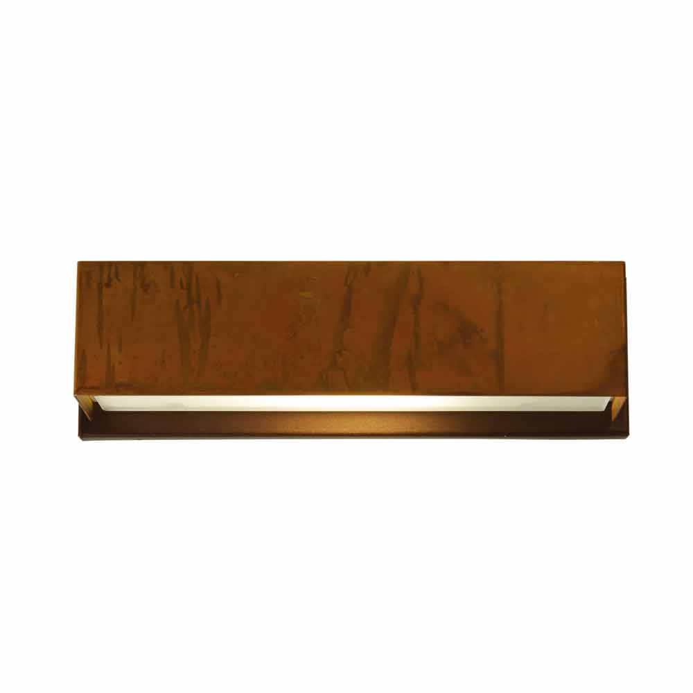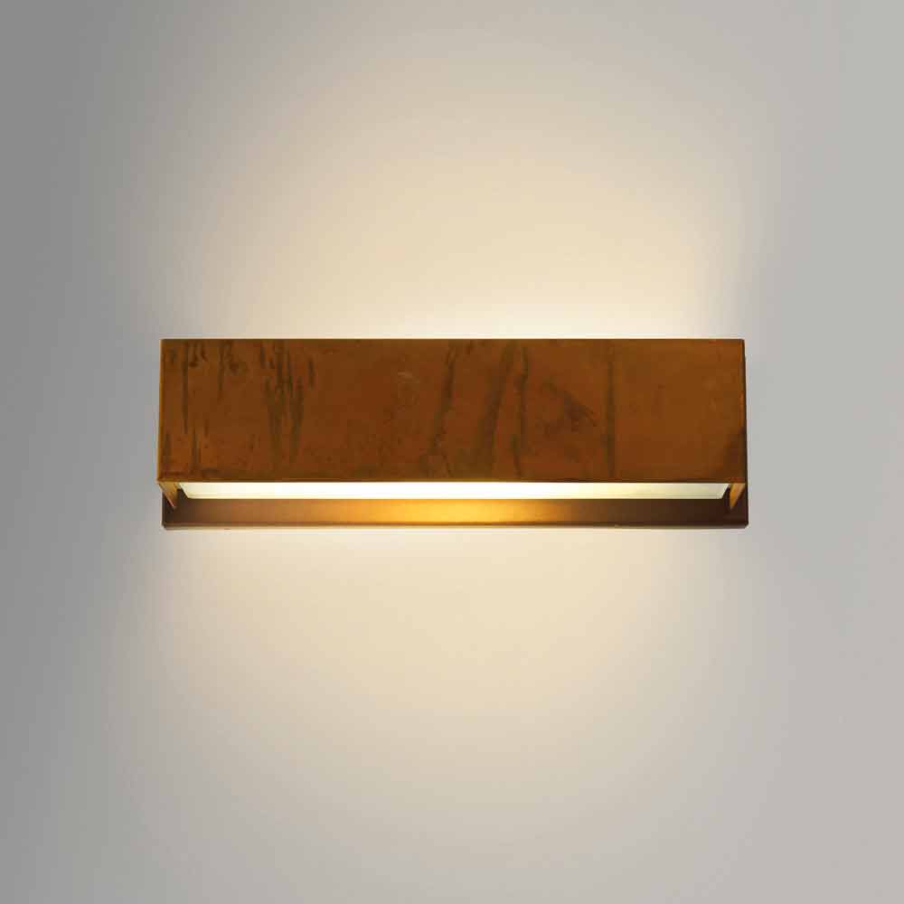 Luminária de parede com estrutura em latão oxidado e sub-base em aço revestido a pó epóxi. Disponível em dois tamanhos na forma redonda ou quadrada. Difusor de vidro temperado para emissão de luz direta e indireta.
