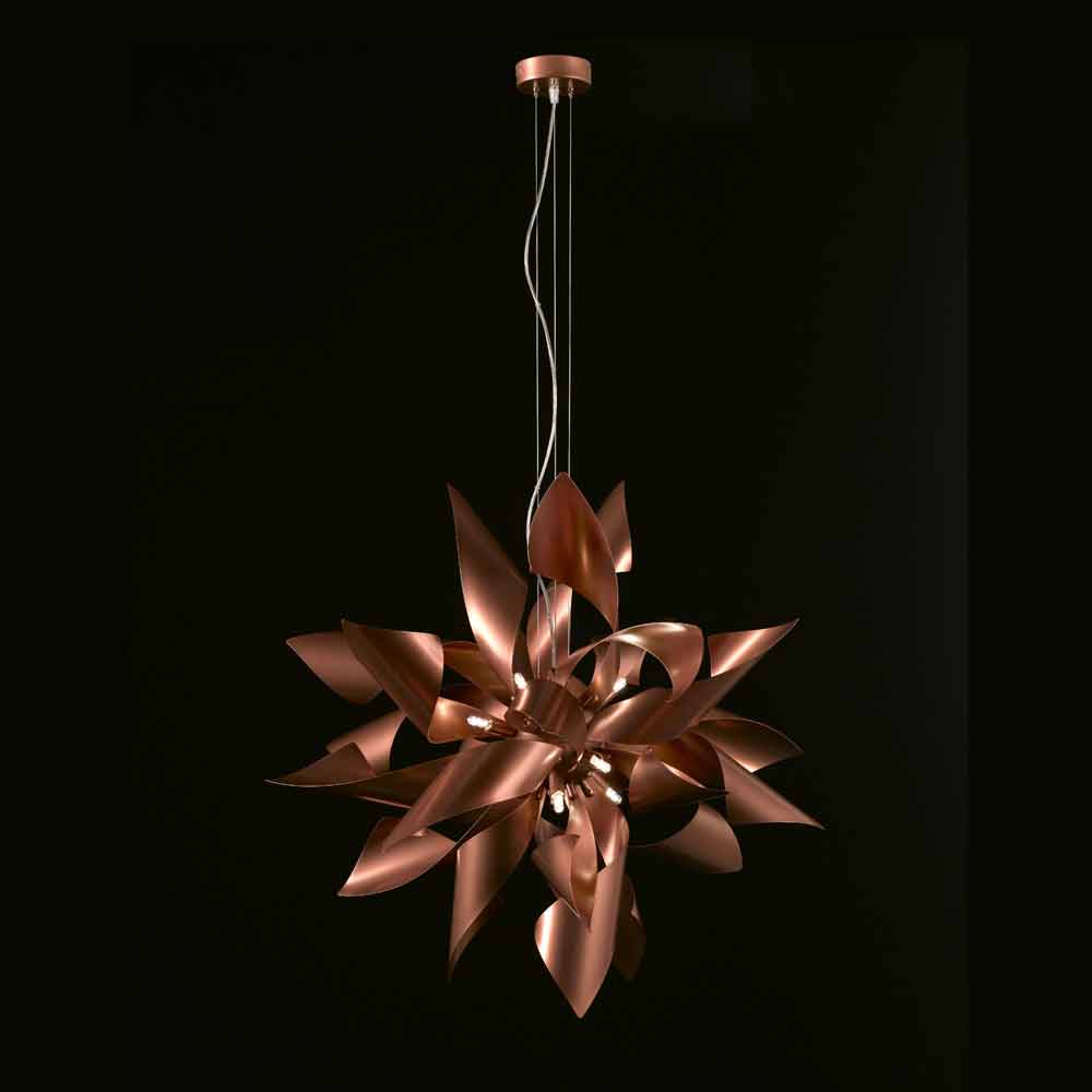 Gengibre é uma coleção surpreendente com dimensões importantes, capaz de enriquecer um ambiente graças à presença de suas muitas bandas que dançam no ar. Sendo totalmente feito de metal, a presença das lâmpadas livres garante um excelente resultado brilhante.