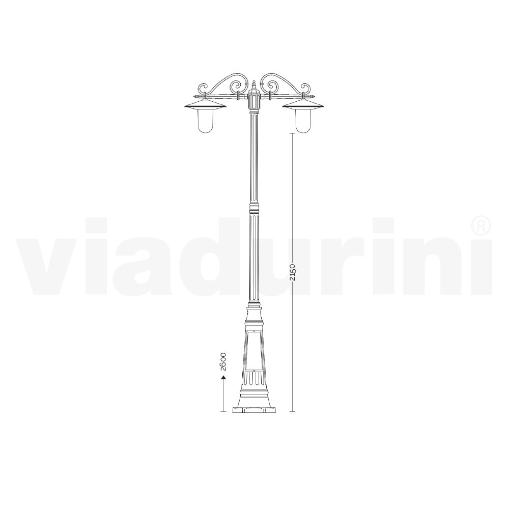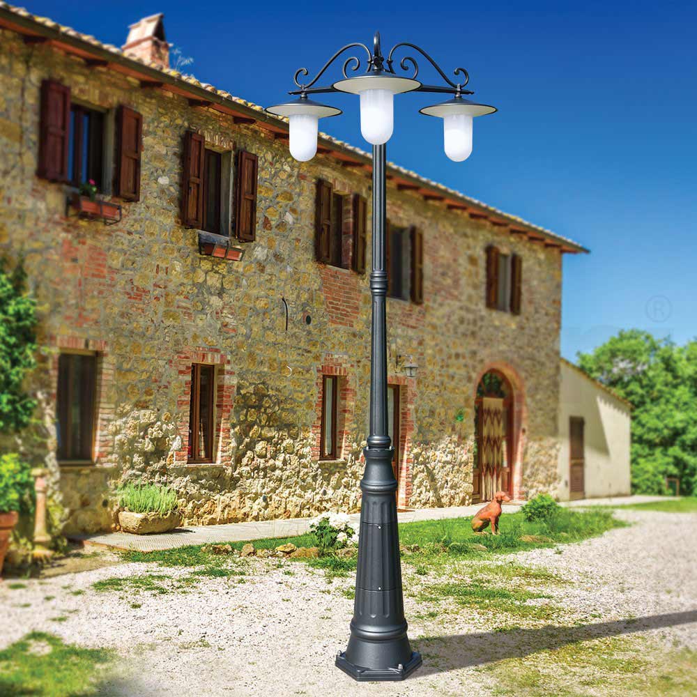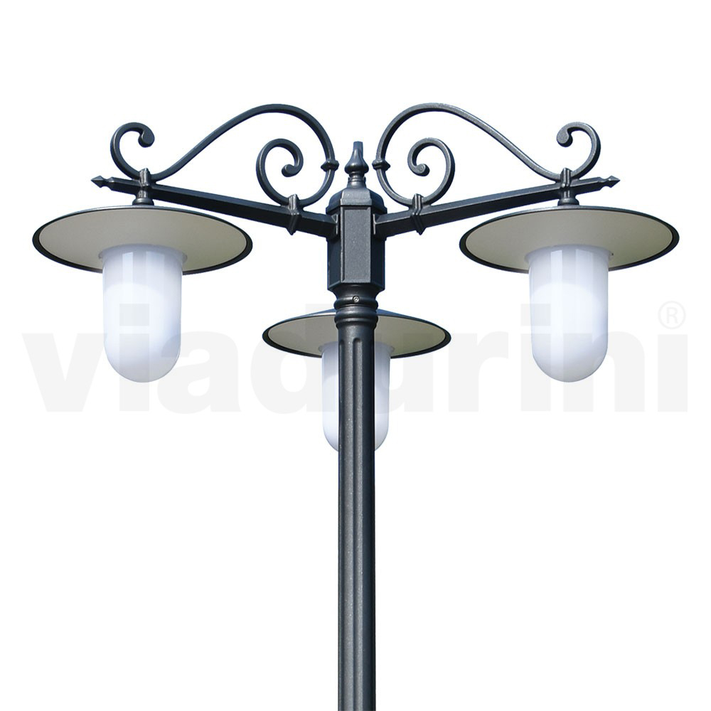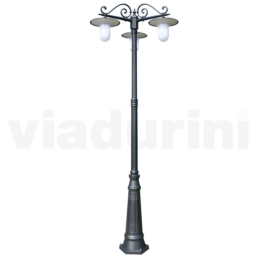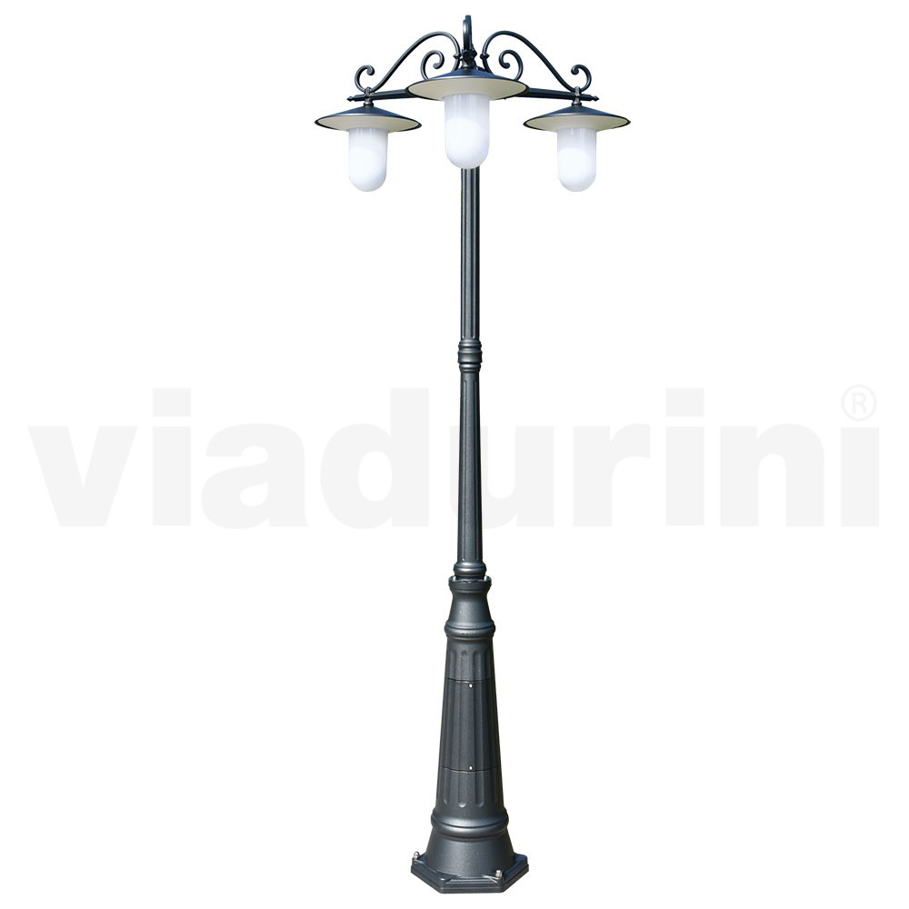 Candeeiro de rua vintage de 3 luzes com estrutura de alumínio cinza Fabricado na Itália.