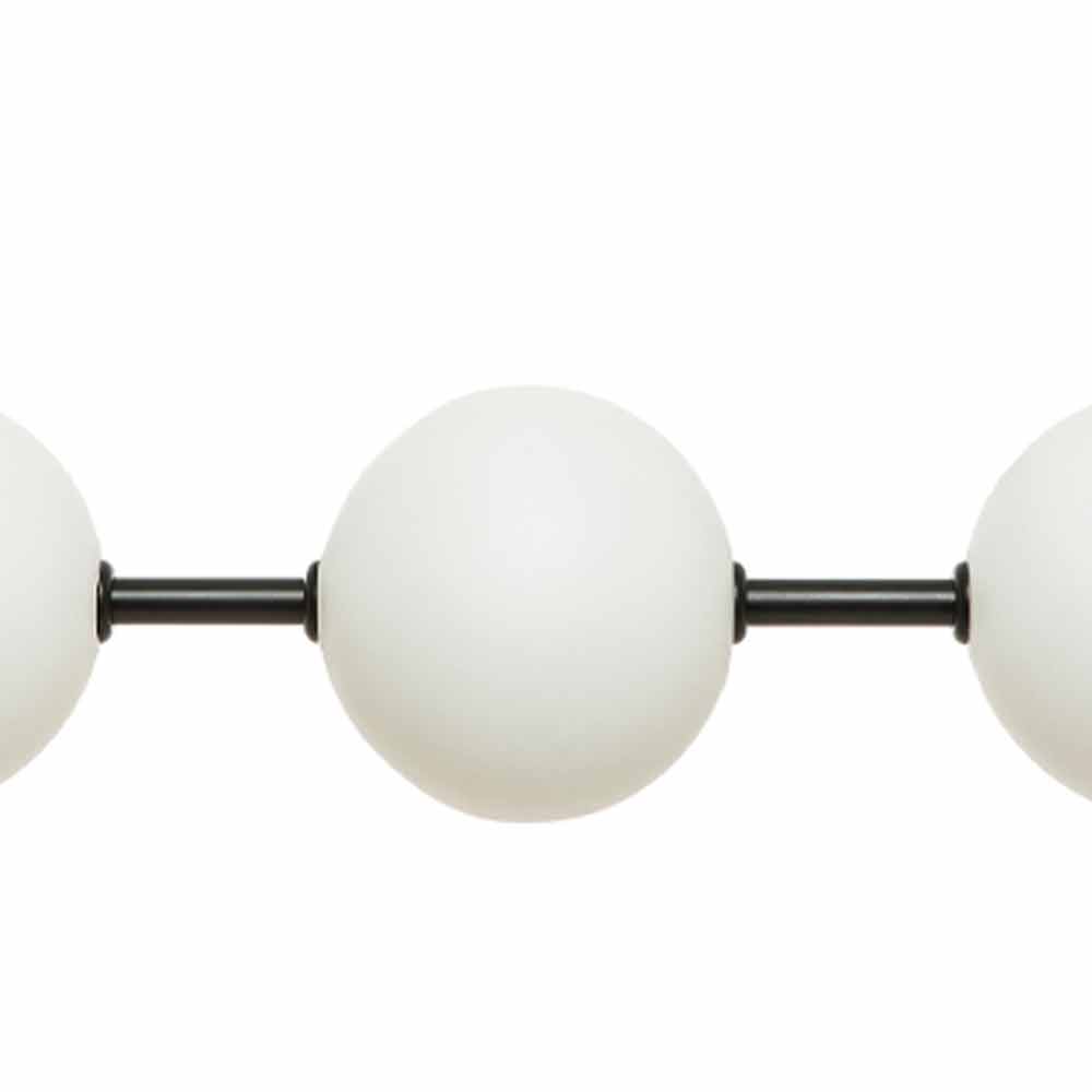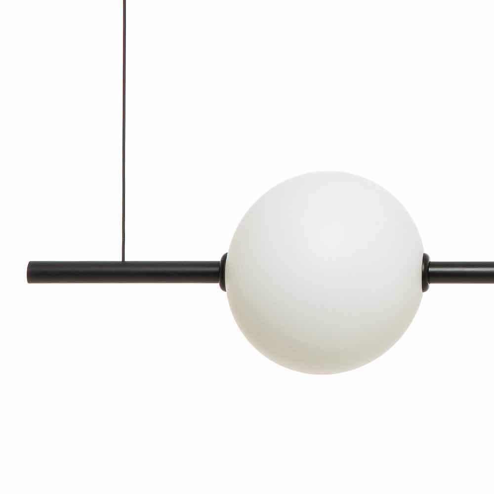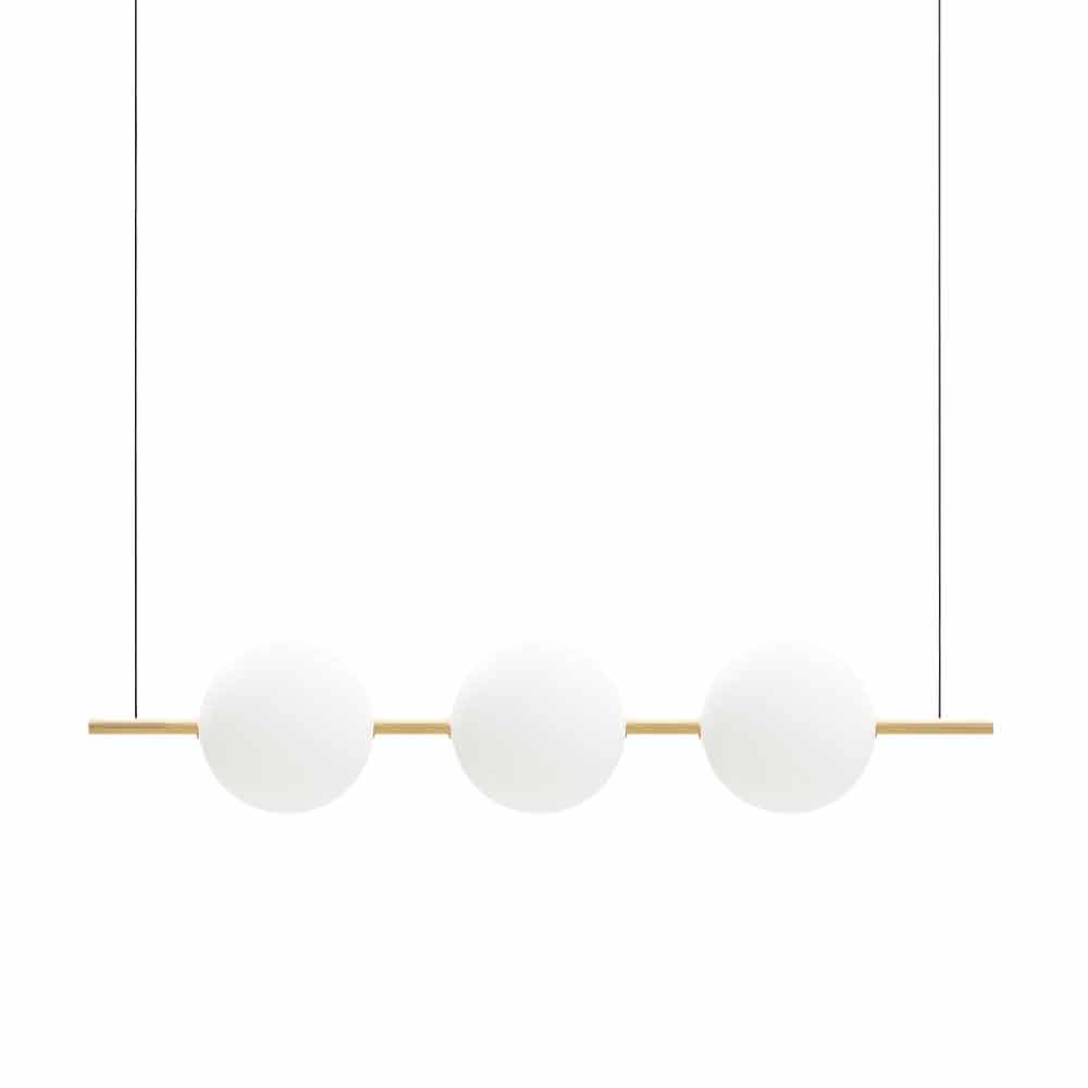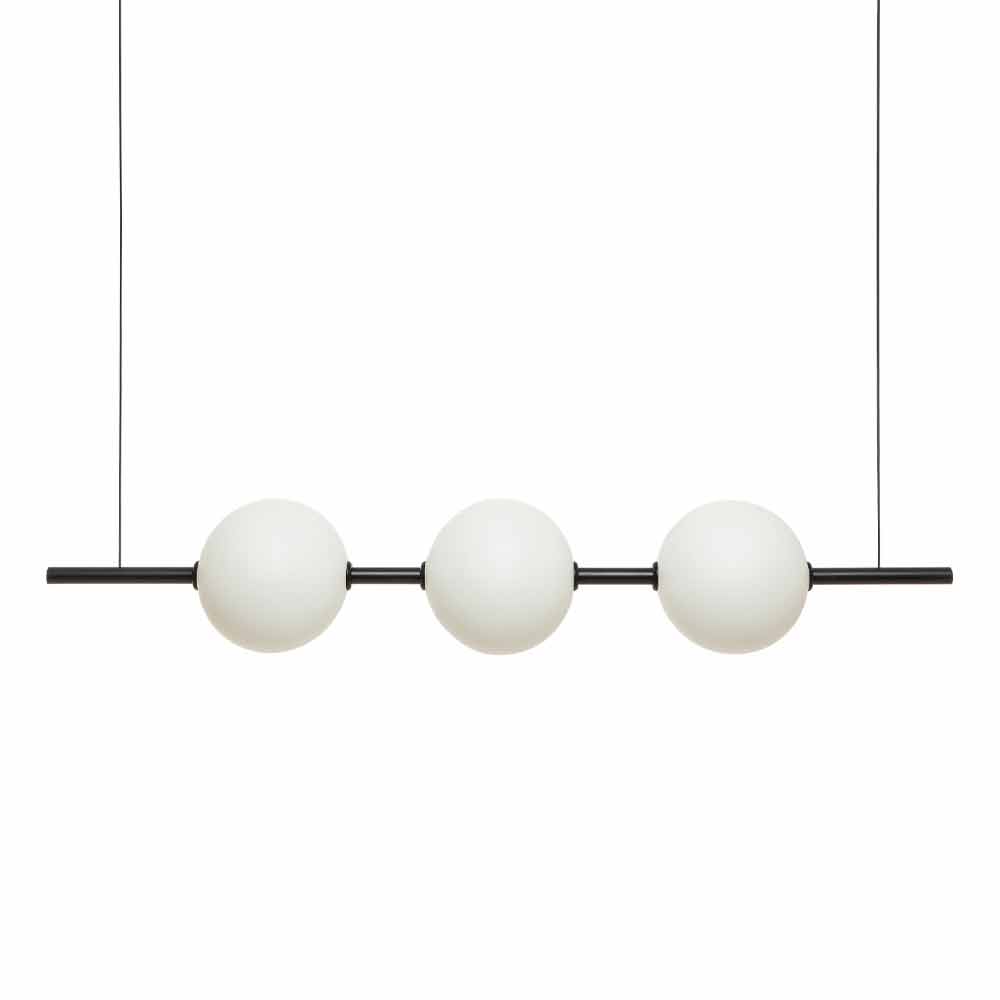 Candeeiro suspenso em latão preto ou escovado com três esferas de vidro borossilicato, fabricado na Itália.
