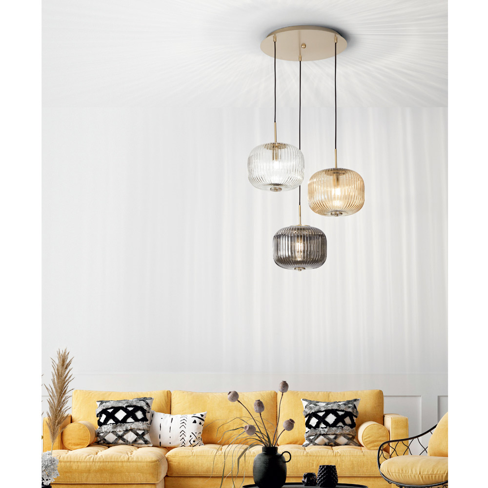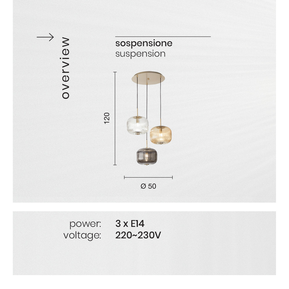 Candeeiro de suspensão com estrutura metálica dourada e três difusores de vidro soprado de cores listradas. Um design pontuado por formas elegantes e requintadas que conferem ao quarto um gosto elegante, enriquecendo a sua estética graças a um toque exclusivo e a uma estética requintada e inovadora . As três cores maravilhosas que sublinham a elegância intemporal do vidro soprado conferem ao aspecto final do produto a sua verdadeira essência delicada e a sua forte personalidade contemporânea , dando vida a uma solução de mobiliário que é tão funcional como esteticamente impressionante e com um forte impacto visual. .