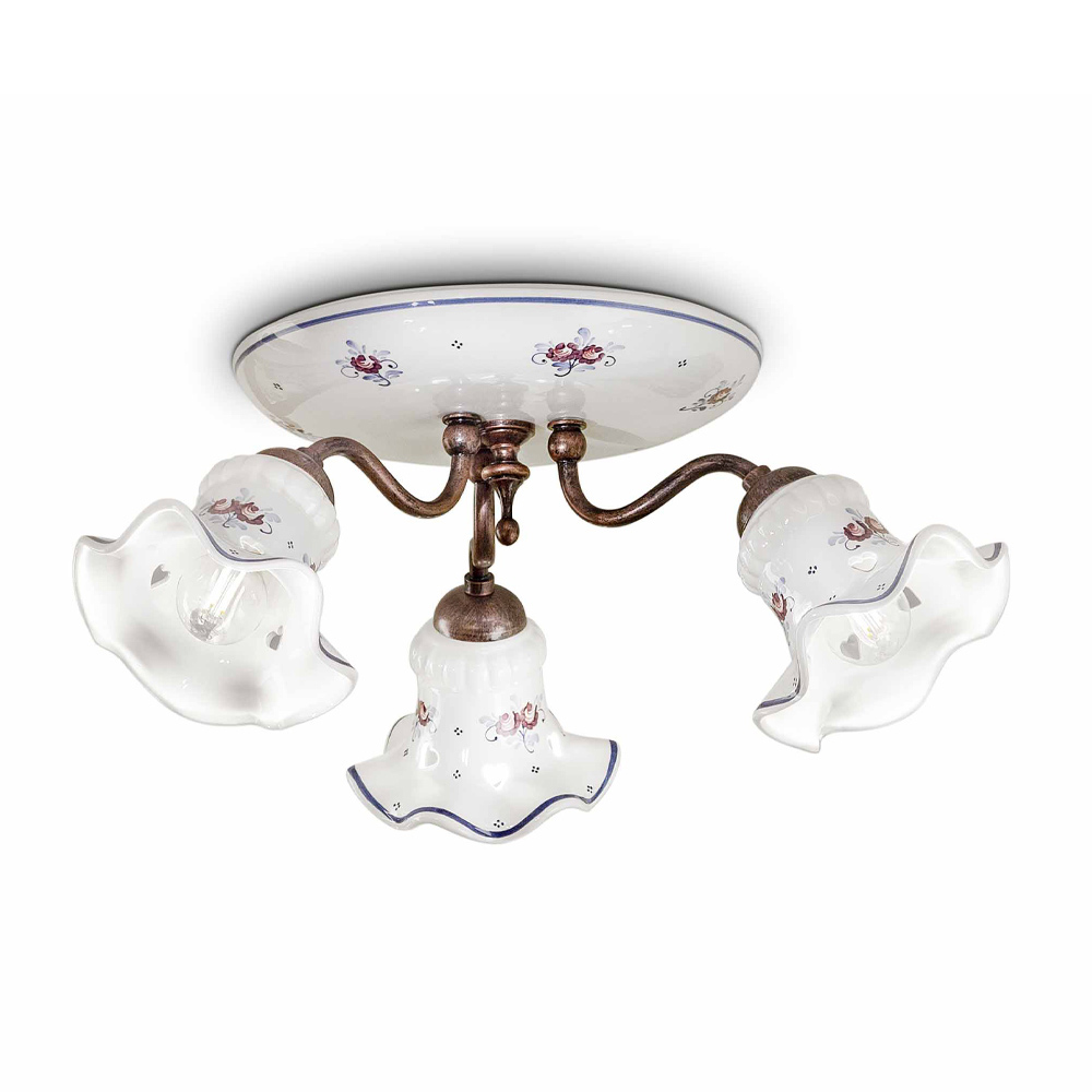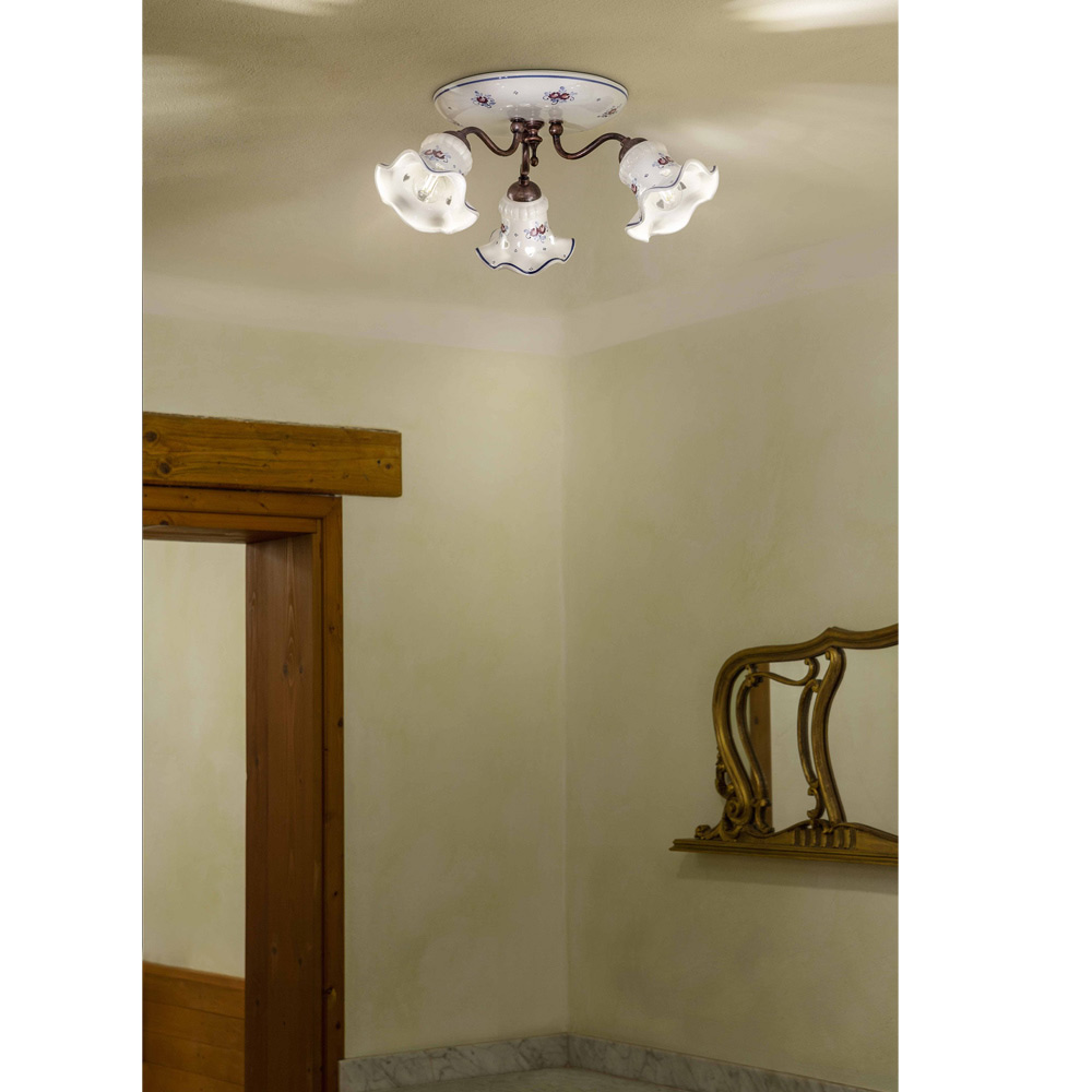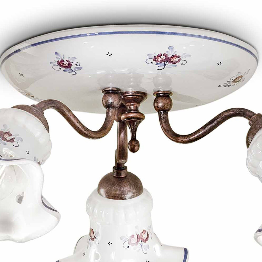 Candeeiro de teto redondo 3 luzes em ferro e cerâmica decorada à mão, fabricada na Itália pela Ferroluce.