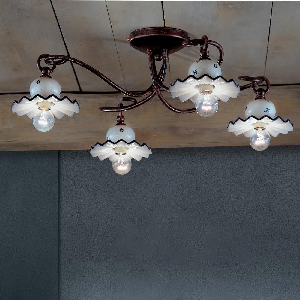 Candeeiro de teto artesanal de 3 ou 4 luzes em metal e cerâmica pintada à mão, fabricado na Itália pela Ferroluce.