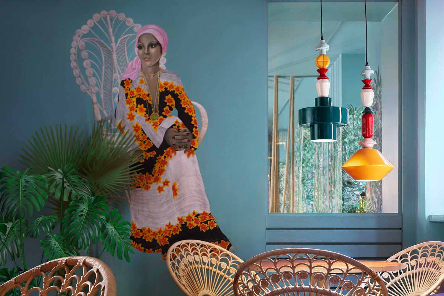 Lariat é embelezado com elementos cerâmicos multicoloridos que se seguem verticalmente até o difusor geométrico central.