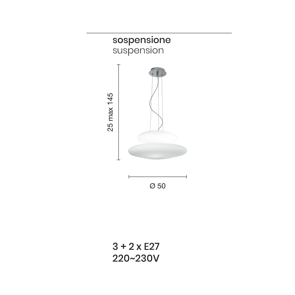 - diâmetro 50 x H 25 cm - H máx. 145 cm (3 + 2 x E27 220-230 V).