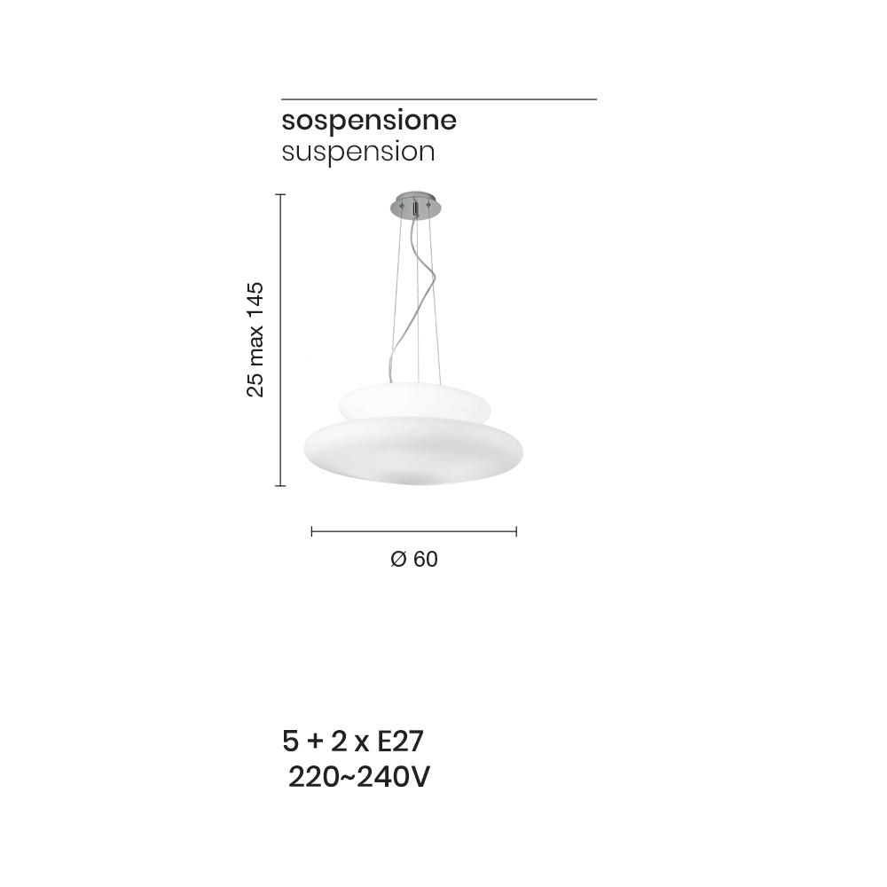 Tamanhos disponíveis:- diâmetro 60 x H 25 cm - H máx 145 cm (5 + 2 x E27 220-230 V);