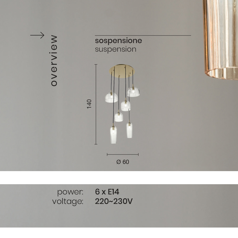 Candeeiro suspenso em vidro fundido às riscas com estrutura metálica.