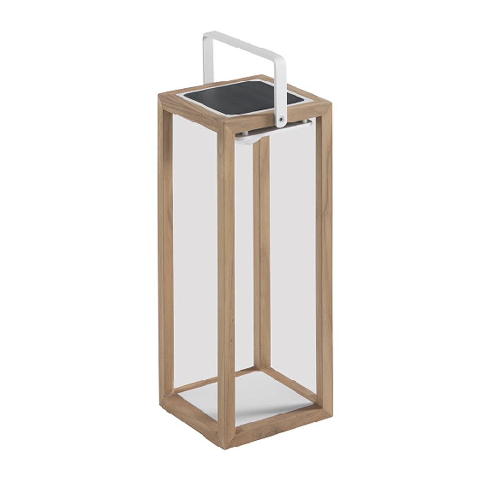alumínio pintado ou teca disponível com estrutura branca e pega branca ou com estrutura teca e pega branca. A luz da lanterna é fornecida por
